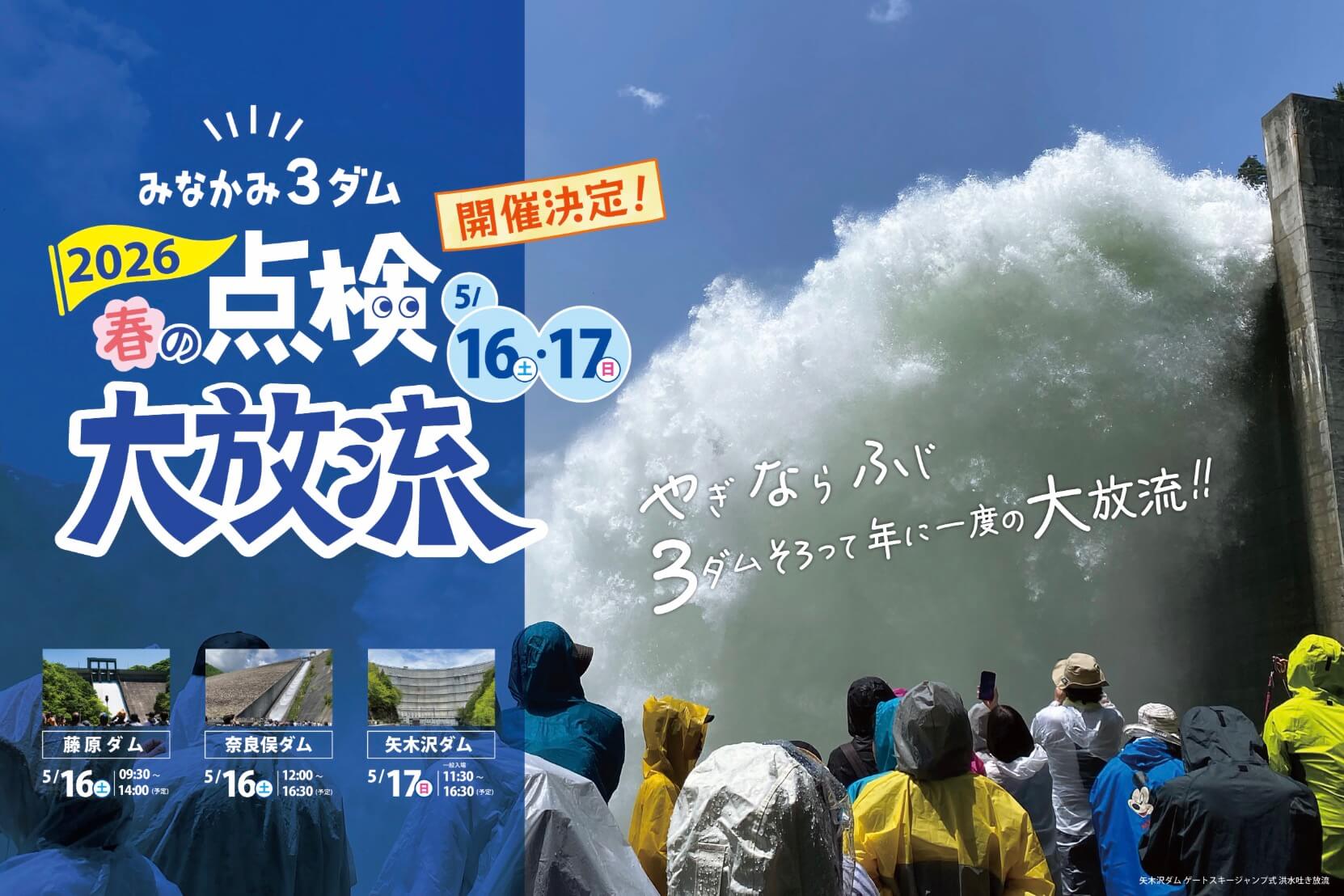 群馬県利根郡みなかみ町で、『みなかみ3ダム 春の点検大放流2026』が2026年5月16日(土)・17日(日)に開催されます。