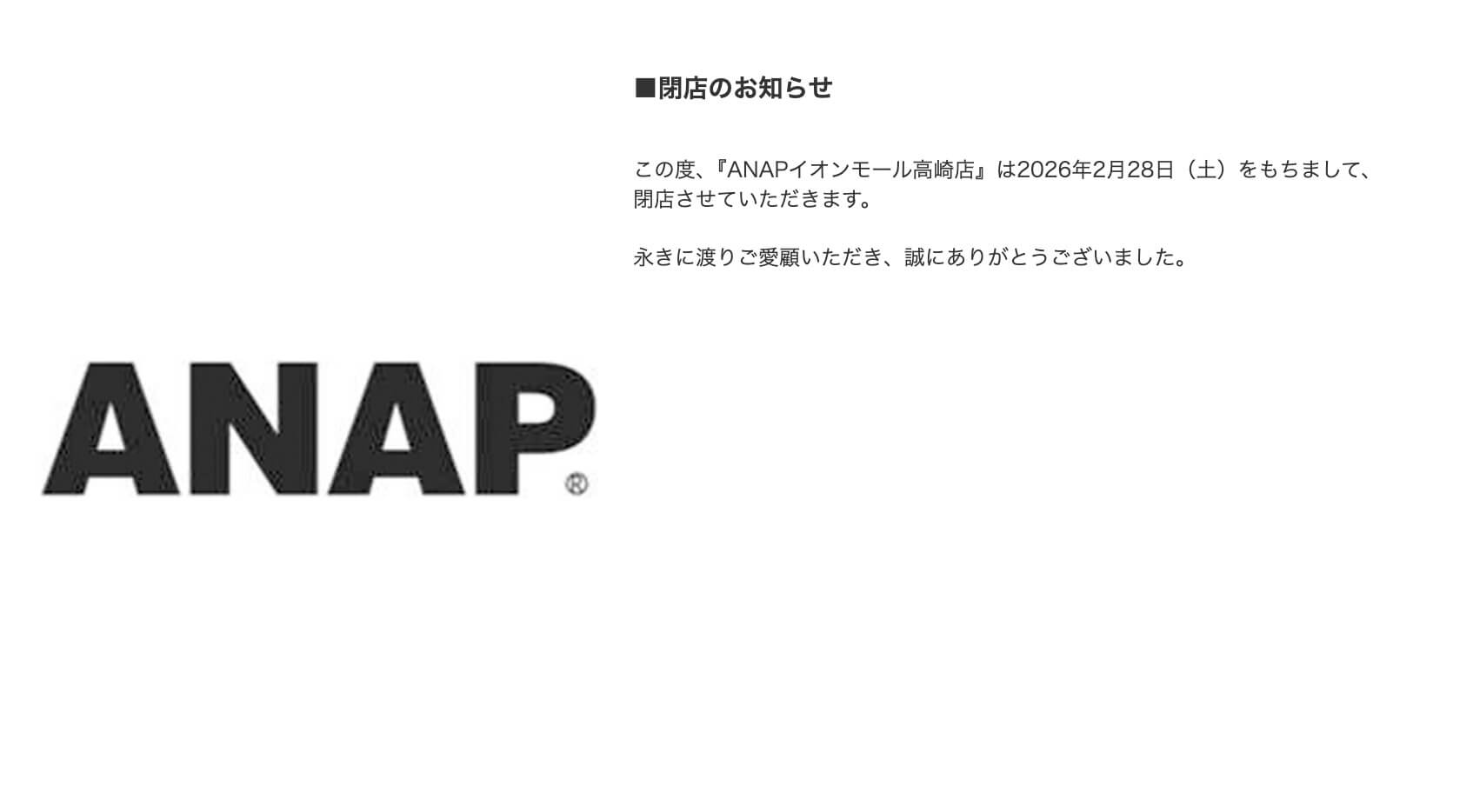 高崎市棟高町「イオンモール高崎」内のアパレルショップ『ANAP(アナップ)イオンモール高崎店』が、2026年2月28日(土)をもって閉店するようです。