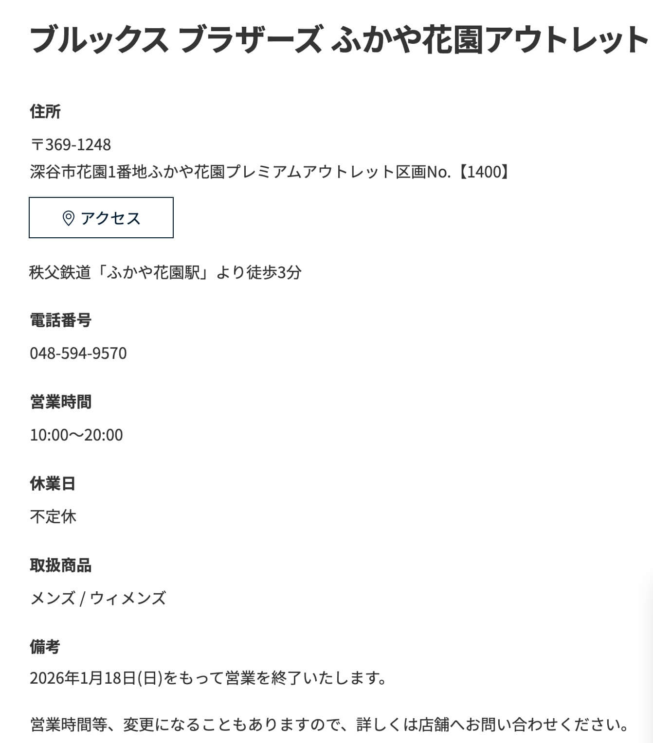 ▼『ブルックス ブラザーズ ふかや花園アウトレット』の閉店情報(公式サイトより)