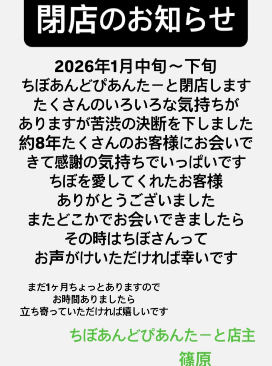 群馬県佐波郡玉村町板井にある『Cibo&Piantato(ちぼあんどぴあんたーと)』が、2026年1月18日(日)をもって閉店予定のようです。