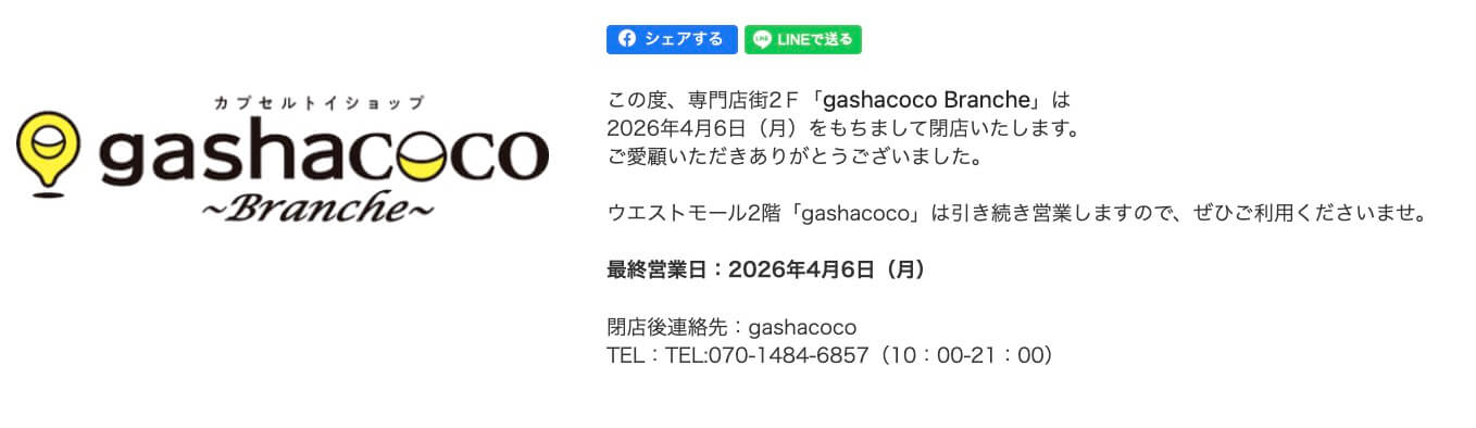 群馬県太田市のイオンモール太田 専門店街2階にある『gashacoco Branche(ガシャココ ブランシェ)』が、2026年4月6日(月)をもって閉店することが分かりました。