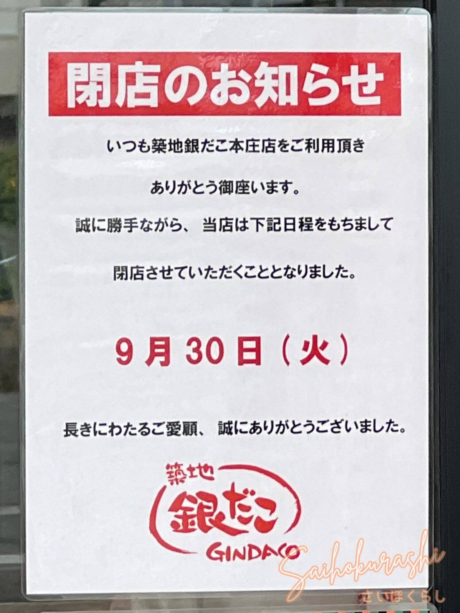 ▼店頭に掲示された『築地銀だこ 本庄照若町店』閉店のお知らせ