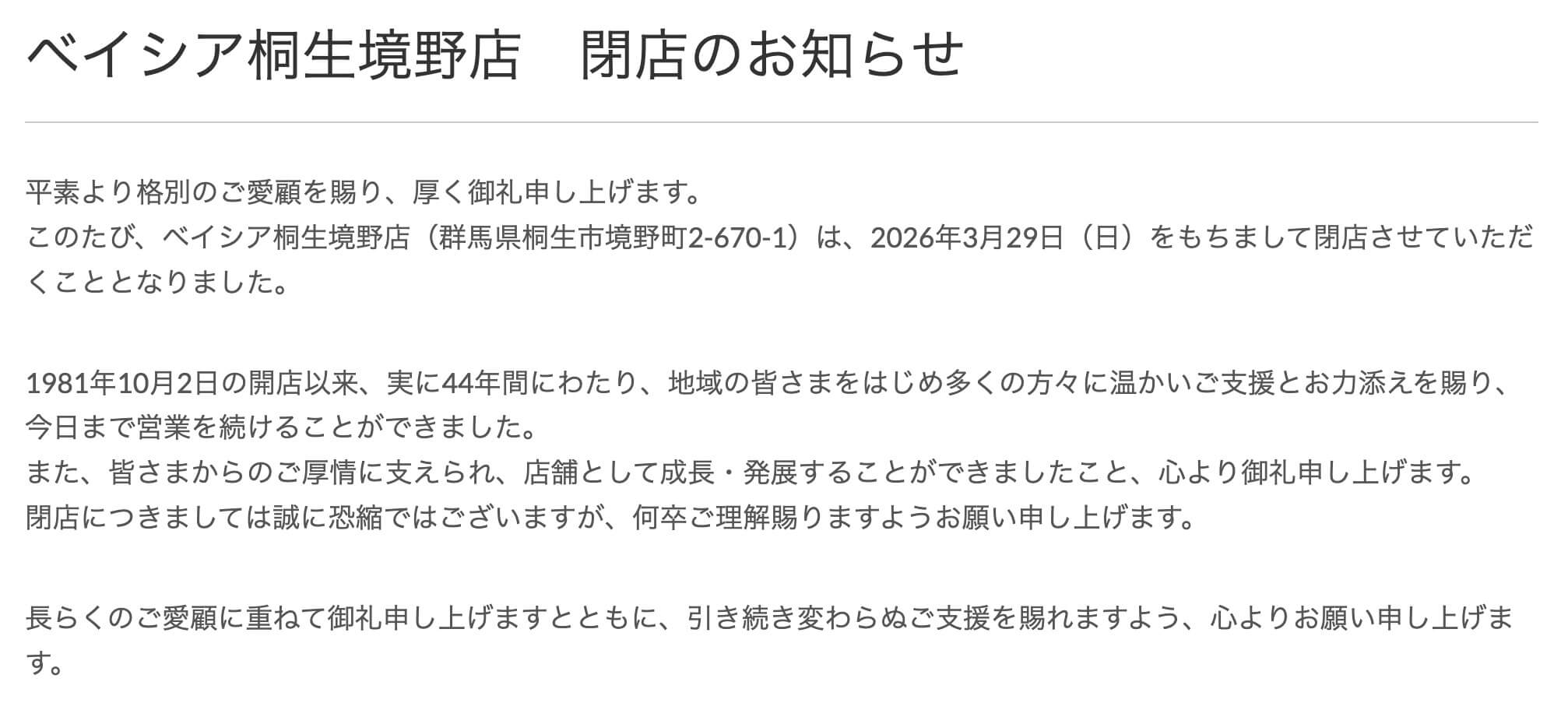 『ベイシア桐生境野店』の閉店情報(公式サイトより)