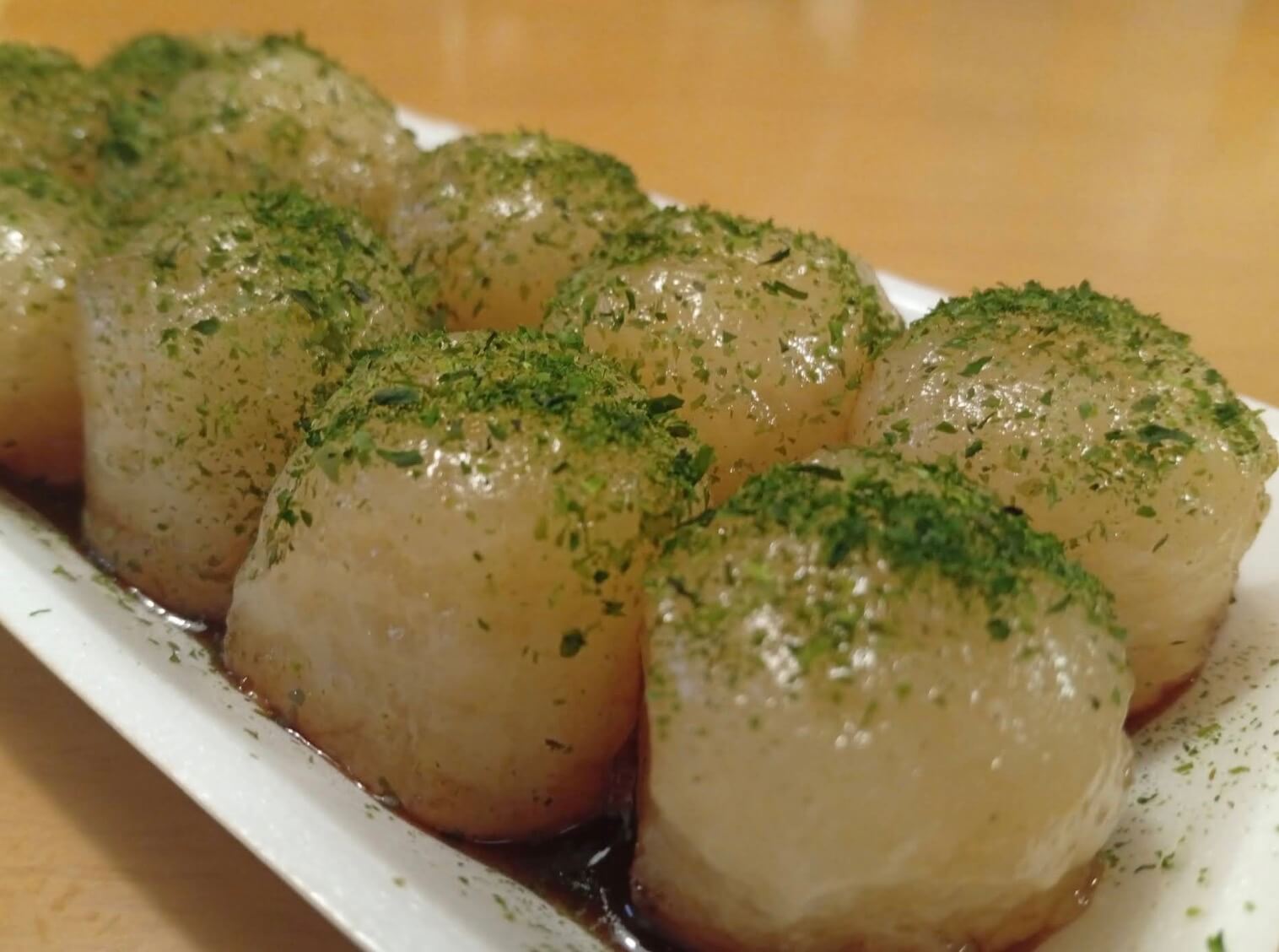 もっちりとした弾力ある食感と、甘辛の特製ソースや青のりをかけて食べるスタイルが特徴。