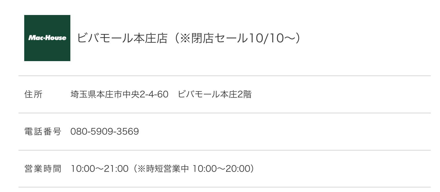 ▼『マックハウス ビバモール本庄店』公式サイト店舗ページより