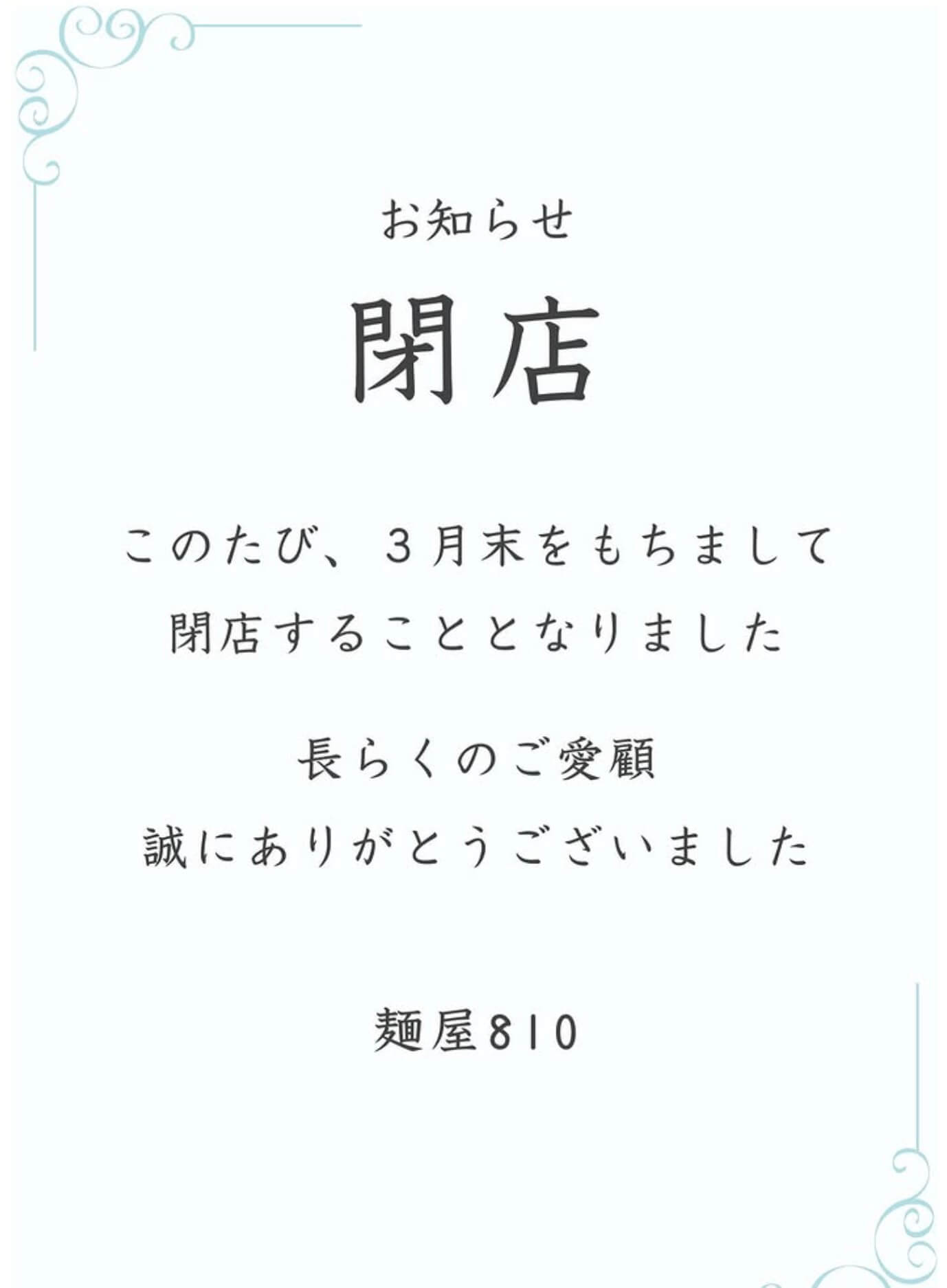 2026年3月末をもって閉店となる『麺屋810』