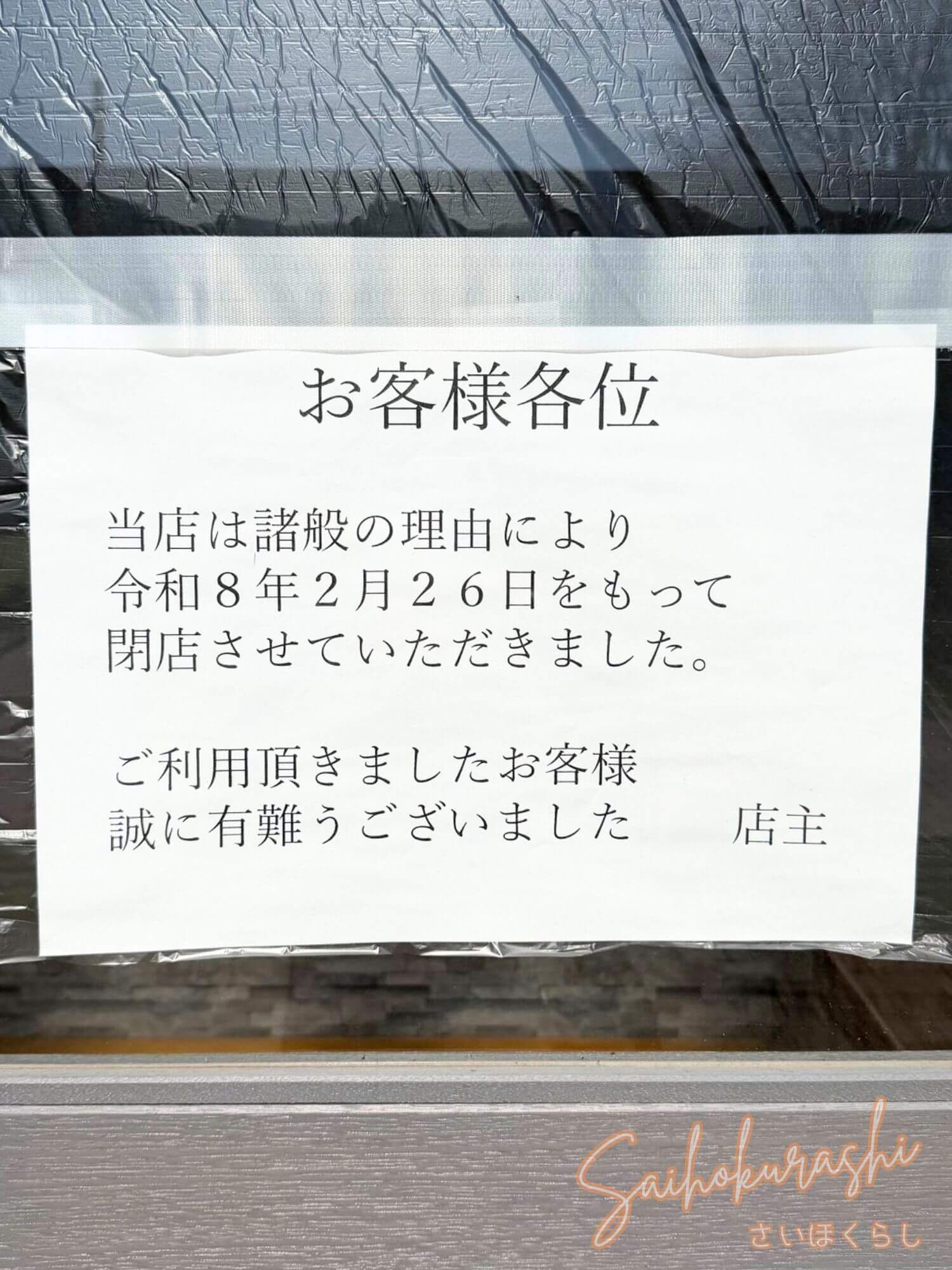 現地にて、閉店のお知らせが掲示されていました。
