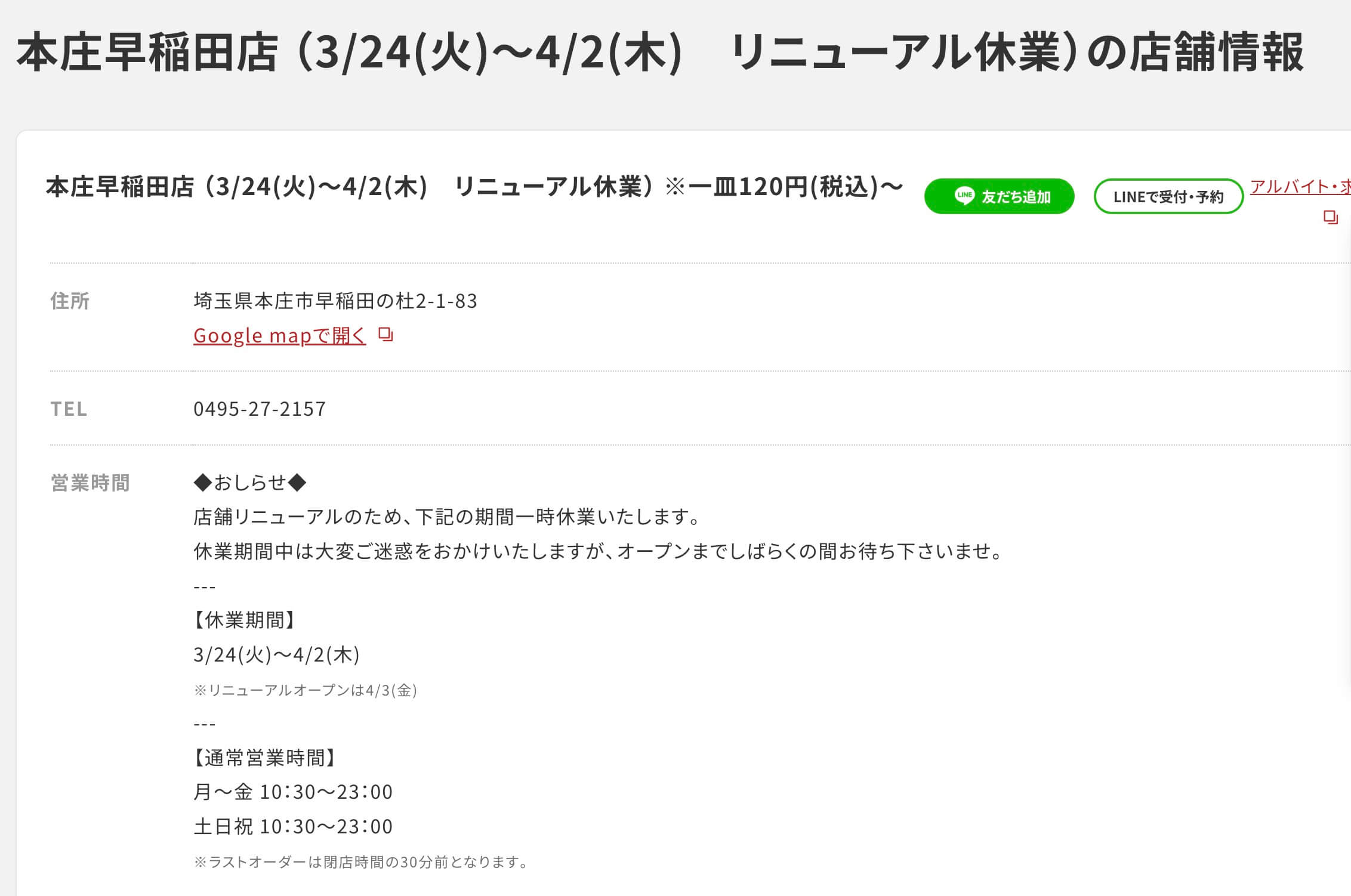 店舗のお知らせによると、リニューアル工事に伴う休業とのこと。営業再開は2026年4月3日(金)を予定しています。