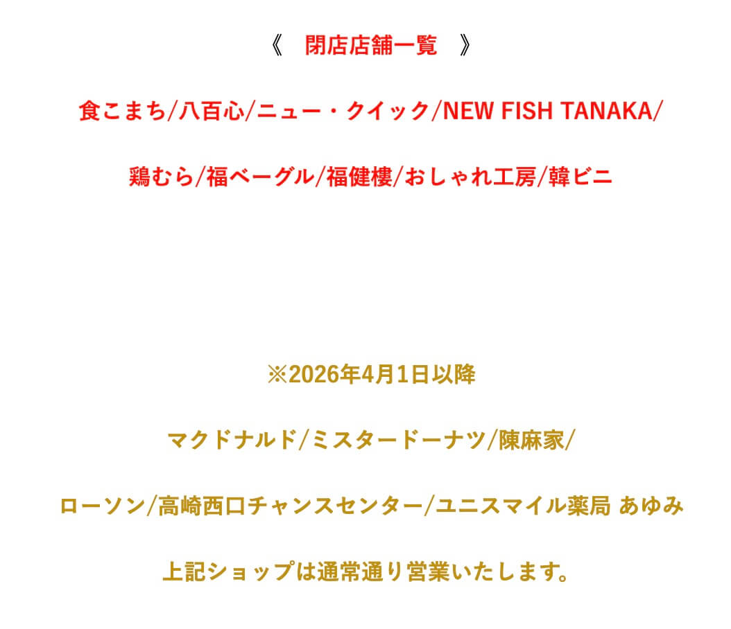 公式案内によると、2026年4月1日以降も下記ショップは通常通り営業予定とのことです。