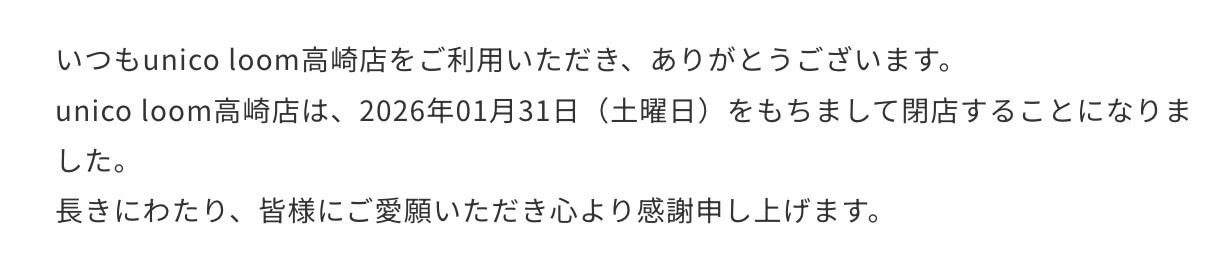 unico loom高崎店は、2026年01月31日(土曜日)をもちまして閉店することになりました。
