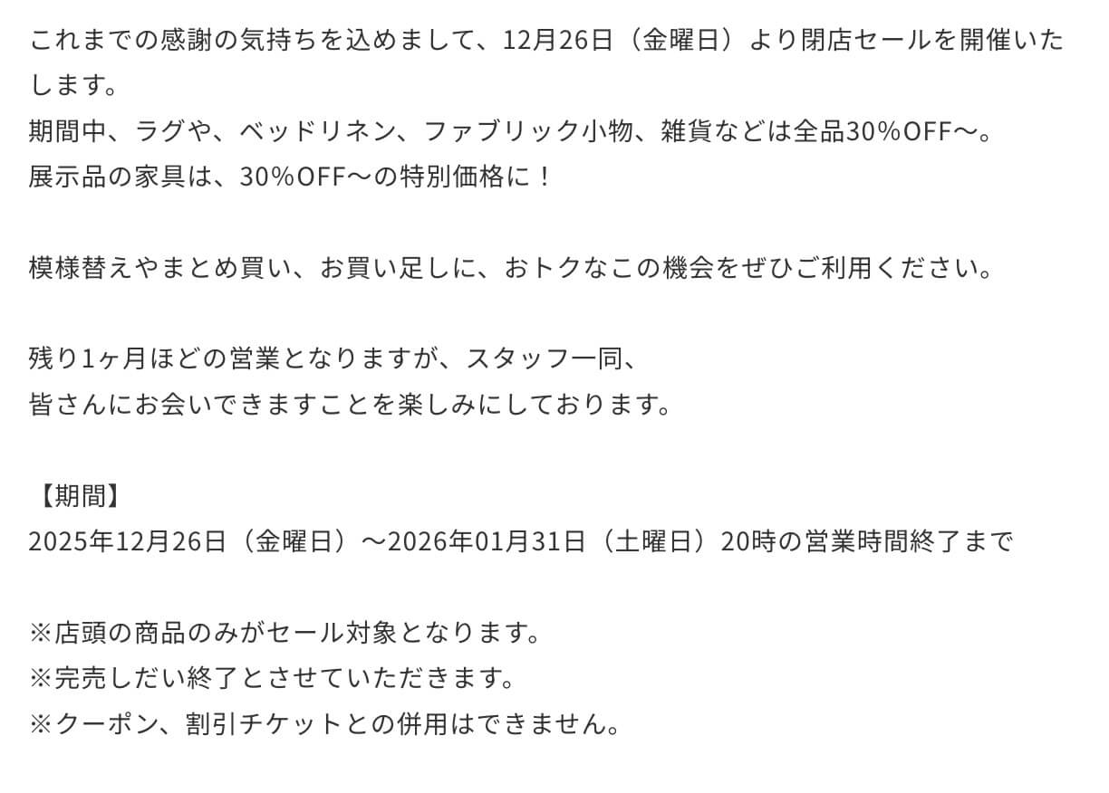 閉店に伴い、2025年12月26日(金)から閉店セールが実施されています。