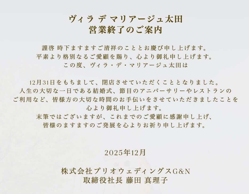 ▼『ヴィラ・デ・マリアージュ太田』閉館のお知らせ(公式サイトより)