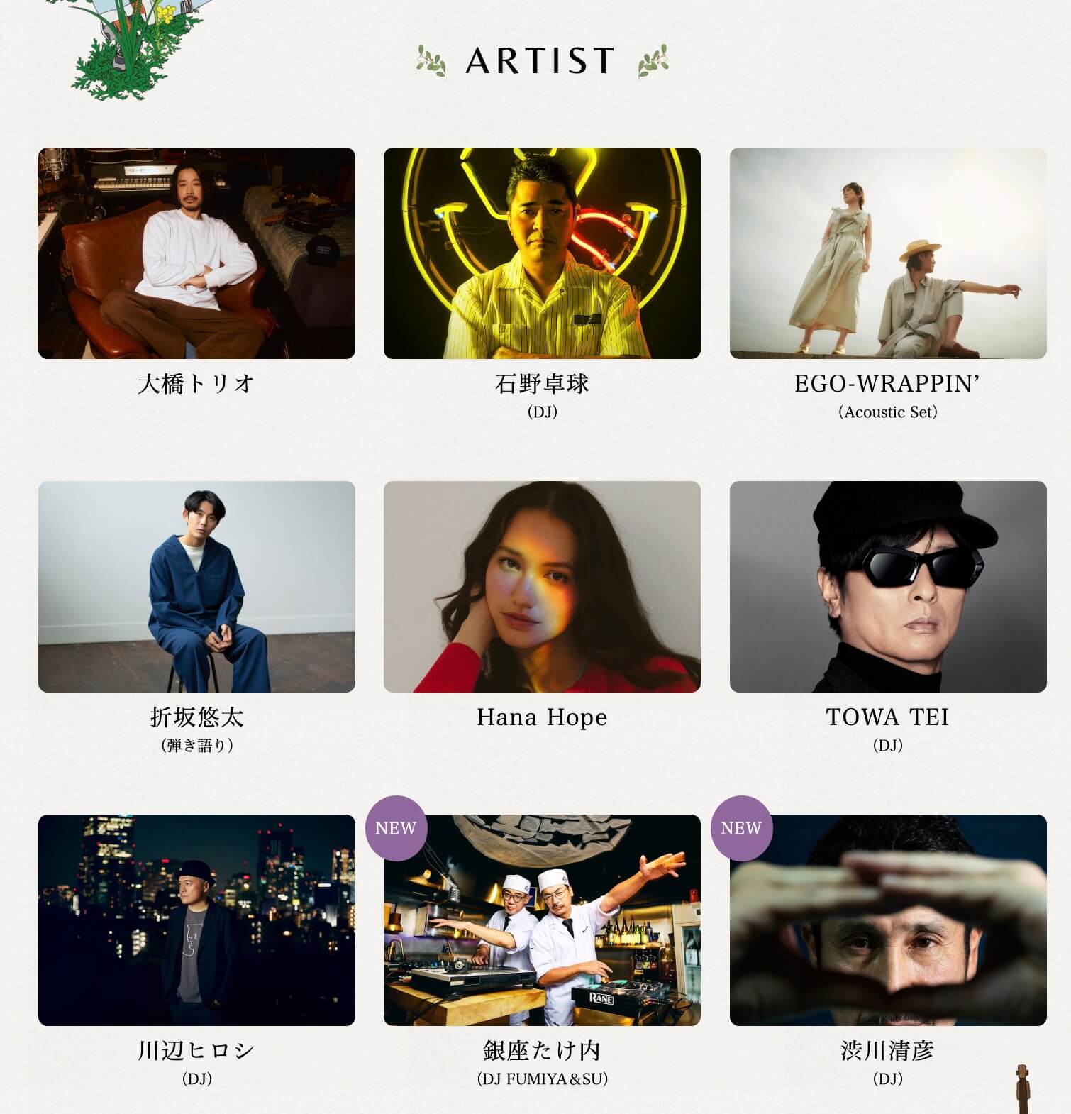 ジャンル横断型のラインナップで、落ち着いた大人向けフェスの雰囲気になりそうな構成です。