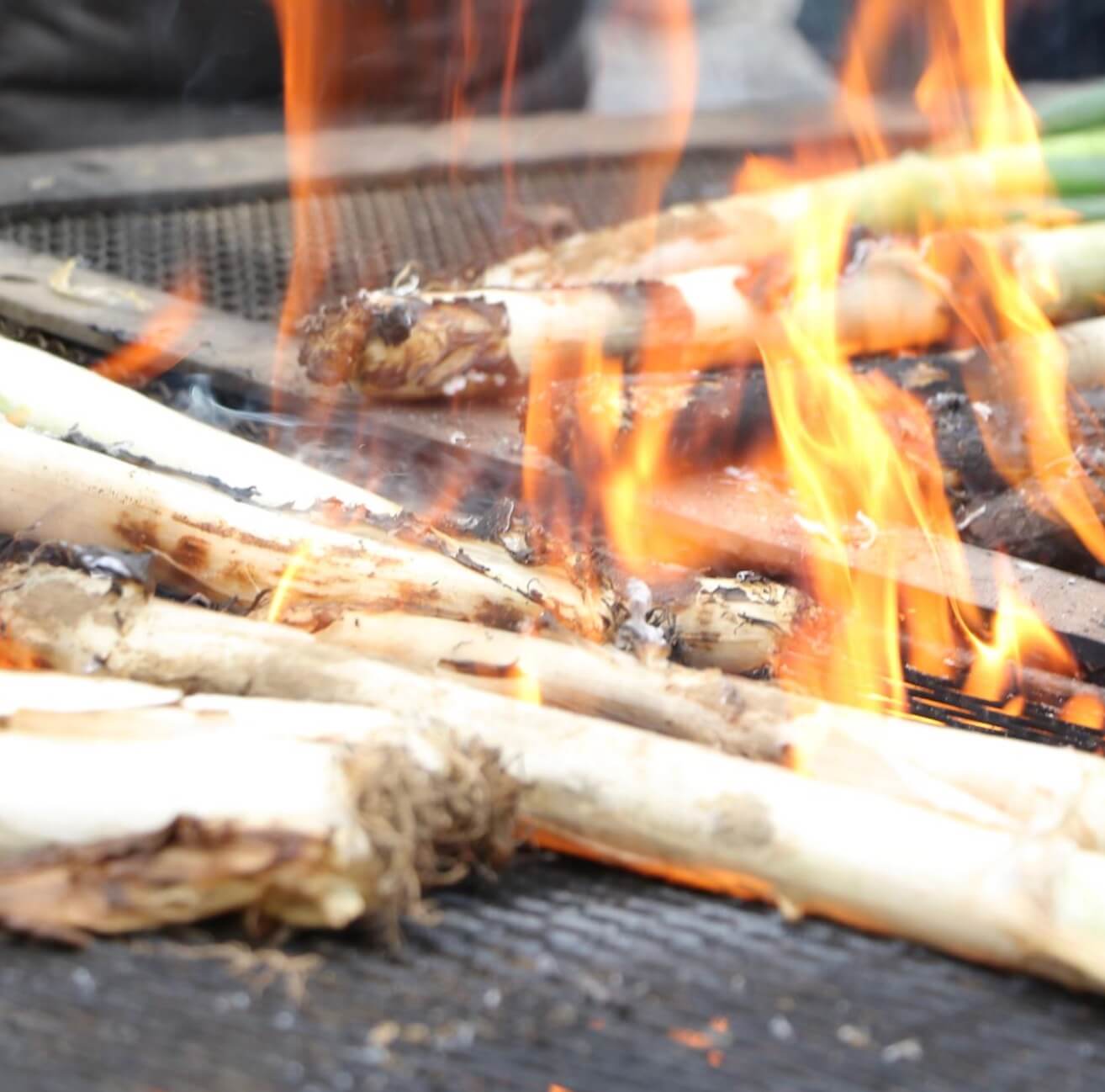 泥つきの深谷ねぎを炭火で焼き、皮をむいて豪快にかぶりつく体験型の名物企画です。