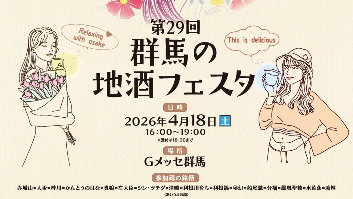 群馬県高崎市岩押町の「Gメッセ群馬」で、『第29回 群馬の地酒フェスタ』が2026年4月18日(土)に開催されます。