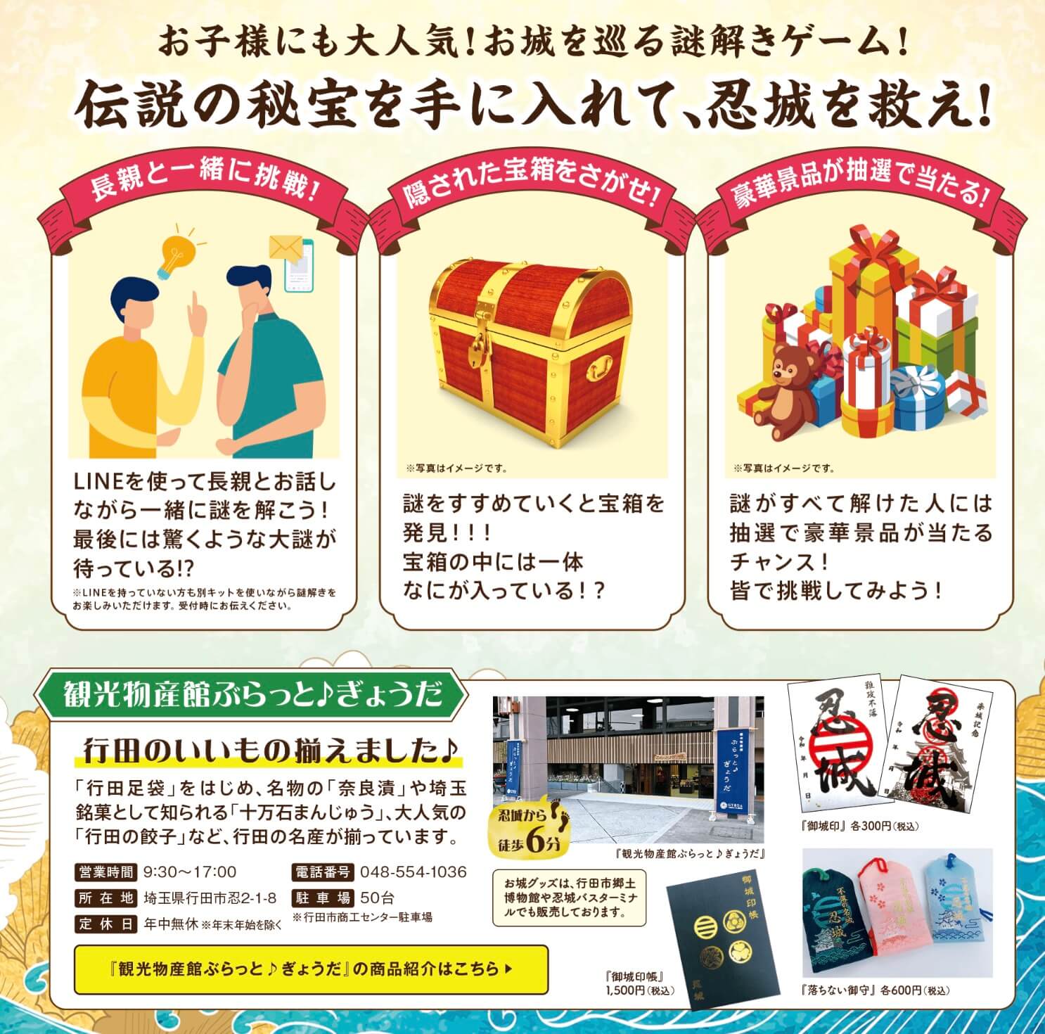 - 内容:忍城周辺を巡りながら謎を解く体験型(周遊型)謎解きゲーム