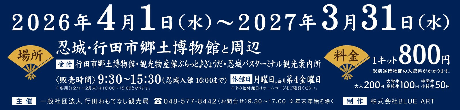 - 受付場所:行田市郷土博物館/観光物産館ぶらっと♪ぎょうだ/忍城バスターミナル観光案内所