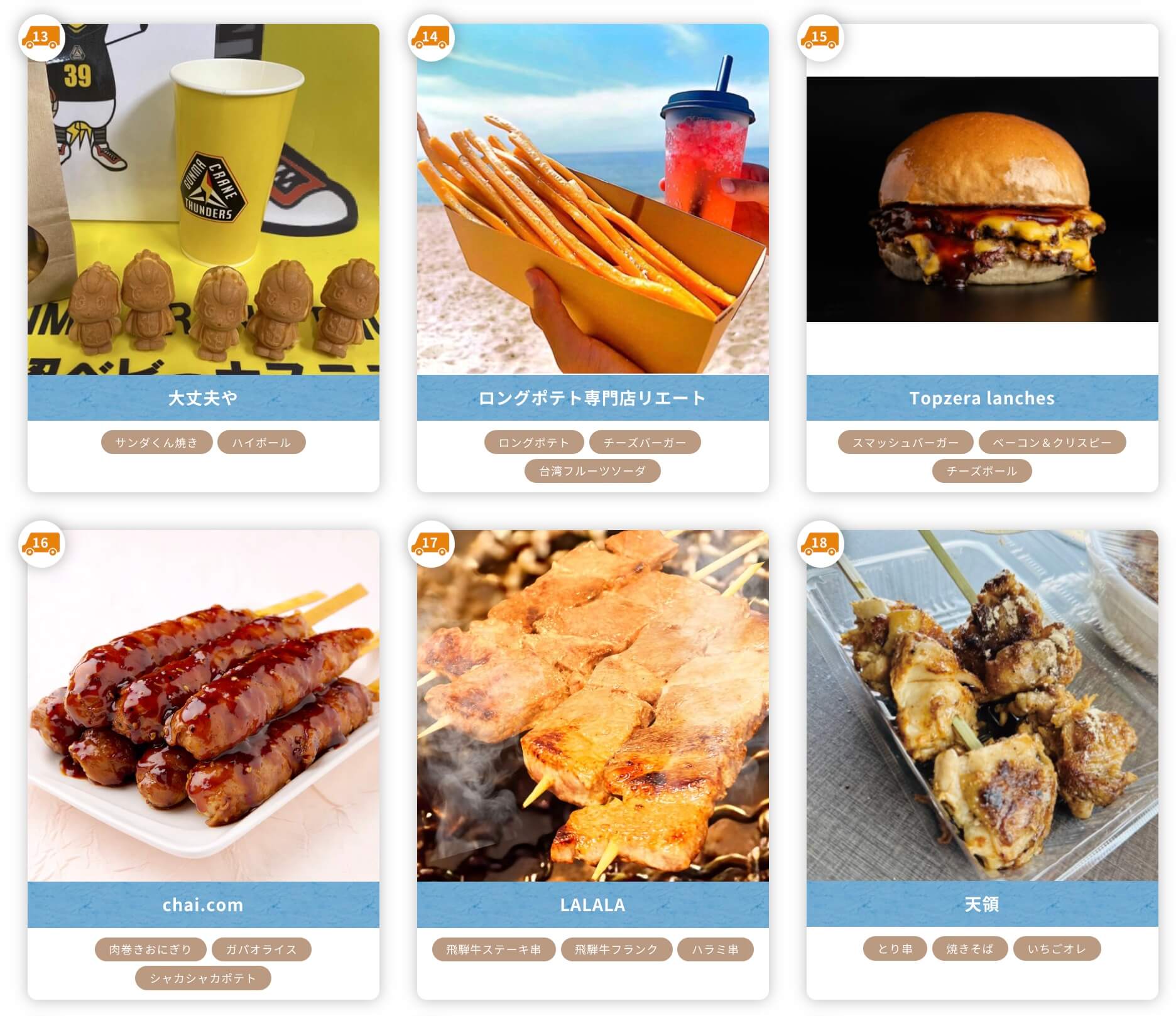 大盛り焼きそばやロングポテト、飛騨牛ステーキ串などの“ガッツリ系”をはじめ、台湾スイーツや焼き芋スイーツ、ベビーカステラなどの“甘いもの系”も充実。家族連れでも選びやすく、幅広い年齢層が楽しめる内容になっています。