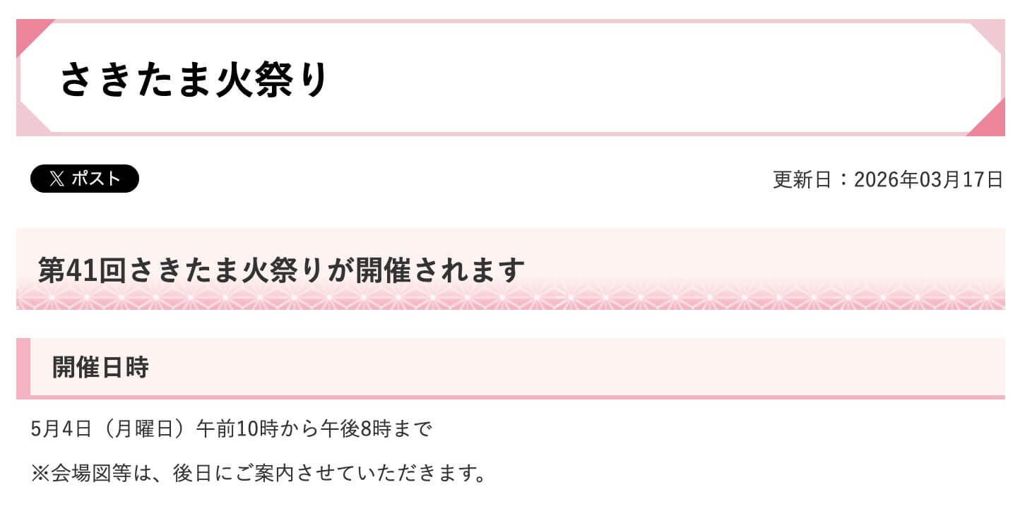 ゴールデンウィーク期間中に開催される大型イベントとして、例年多くの来場者でにぎわう「さきたま火祭り」。