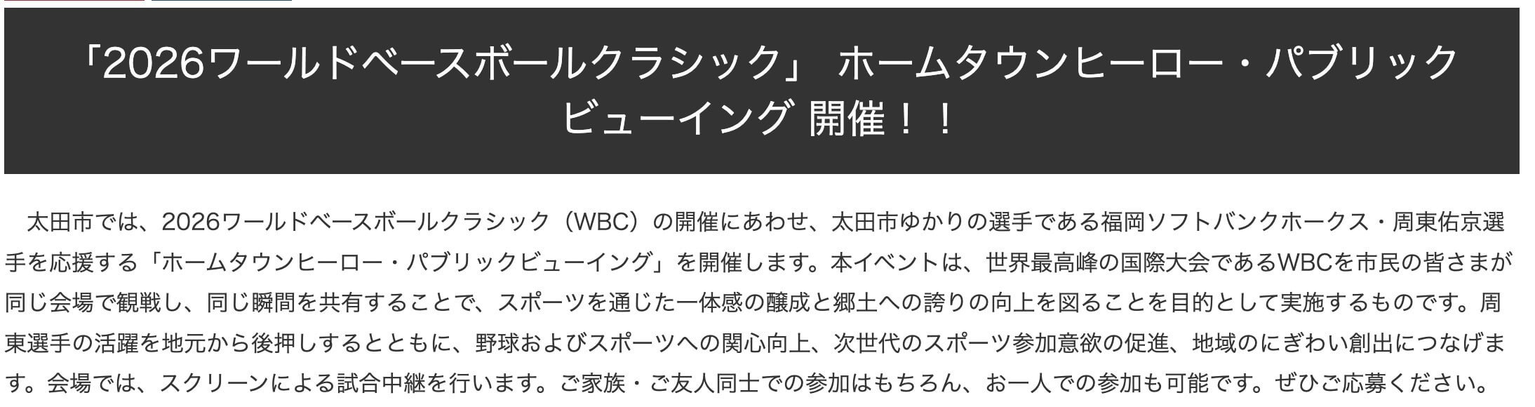 群馬県太田市が、『2026ワールド・ベースボール・クラシック(WBC)パブリックビューイング』を開催することを発表しました。