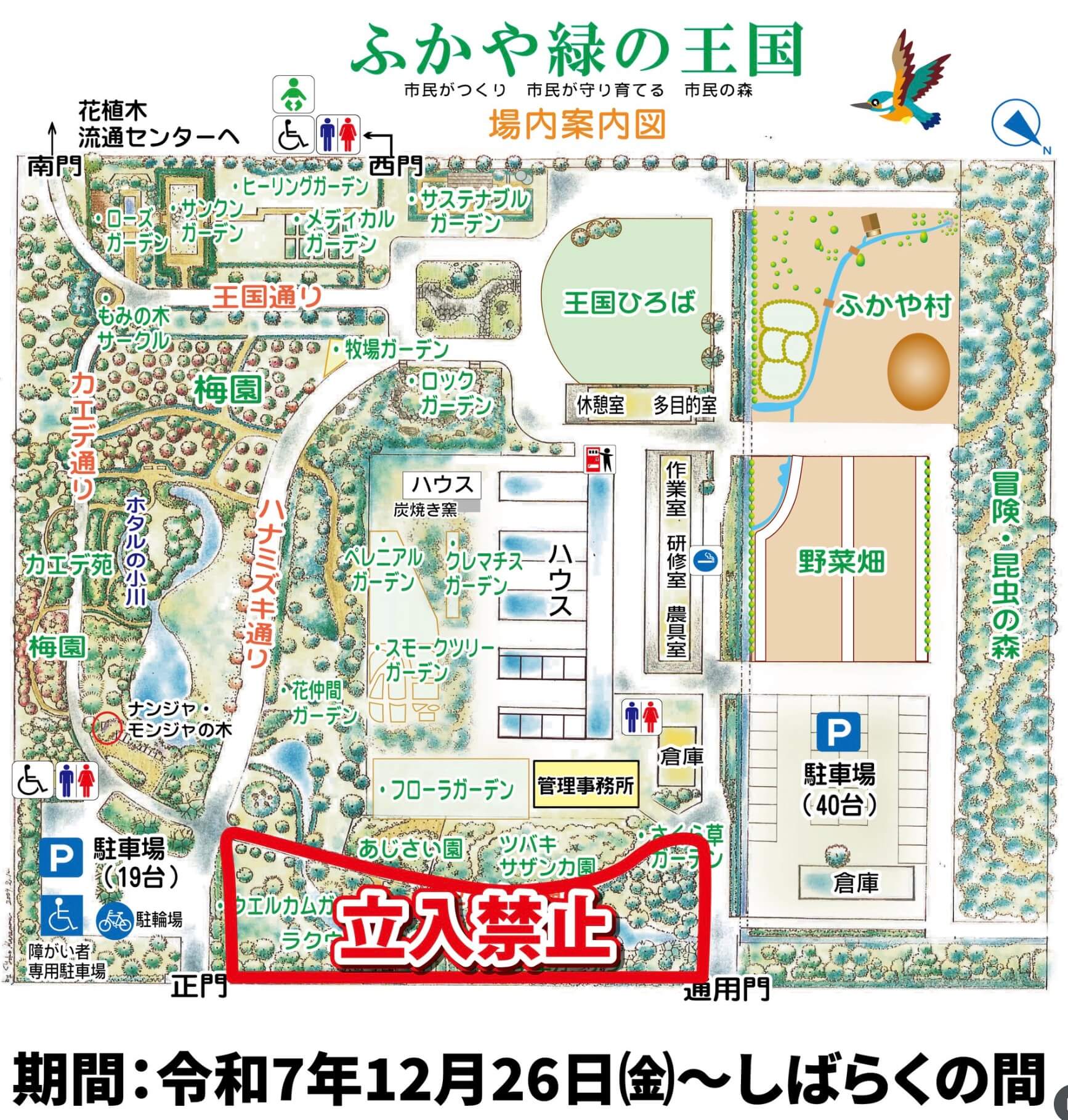 埼玉県深谷市櫛引にある「ふかや緑の王国」で、倒木の危険があるとして、園内の一部エリアが一時的に立入禁止となっています。
