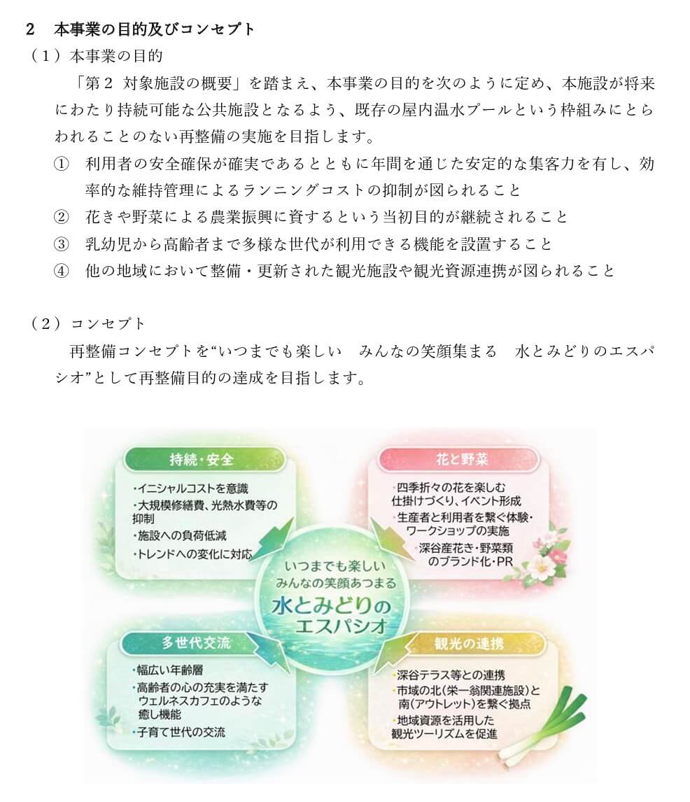 深谷市は再整備コンセプトとして、「いつまでも楽しい みんなの笑顔あつまる 水とみどりのエスパシオ」を掲げています。