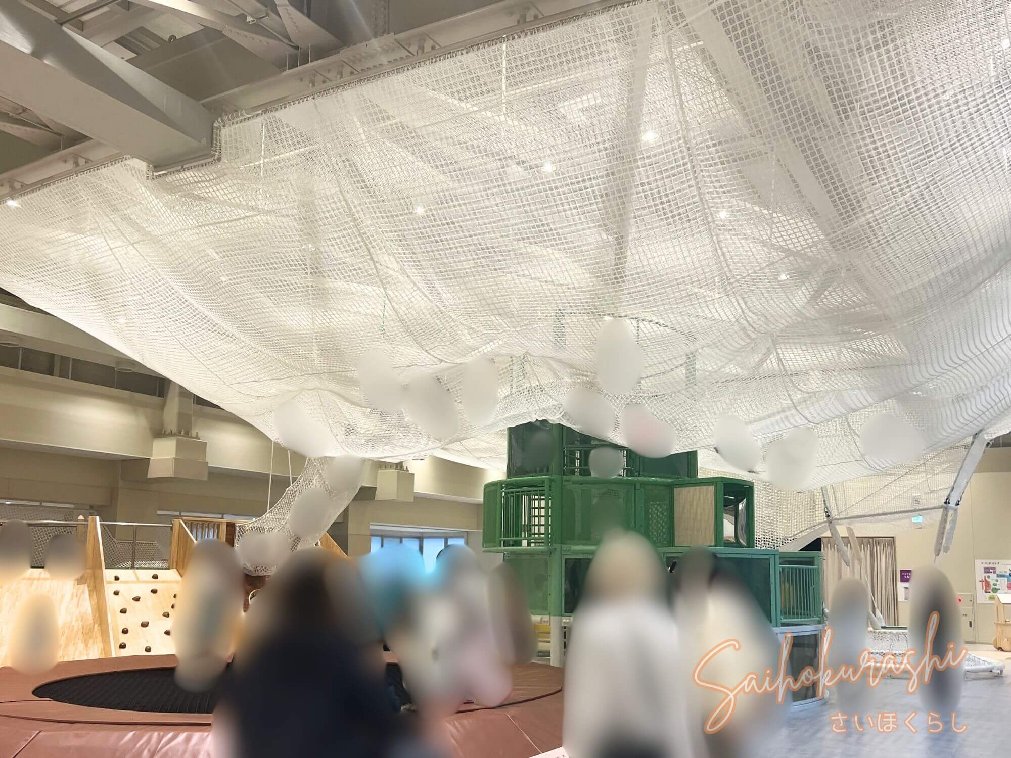 この施設のメイン遊具的なものが、大きなネット遊具。天井付近まで広がる構造になっていて、立体的に遊べるのが特徴です。