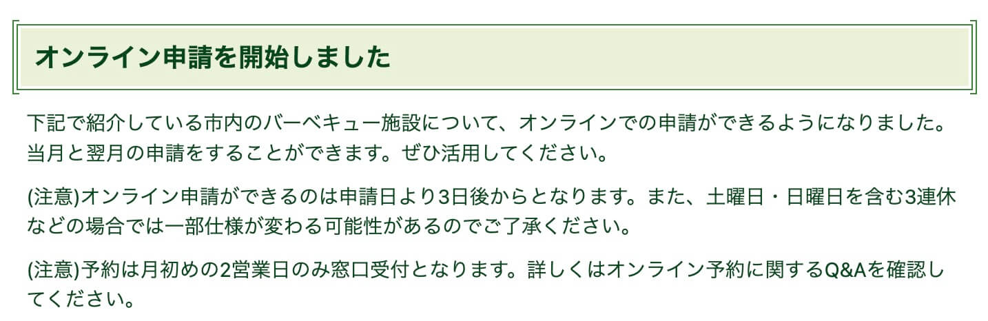 市の案内によると、市内のバーベキュー施設について、これまで窓口中心だった利用申請がオンライン対応となり、当月分と翌月分の予約が可能になっています。