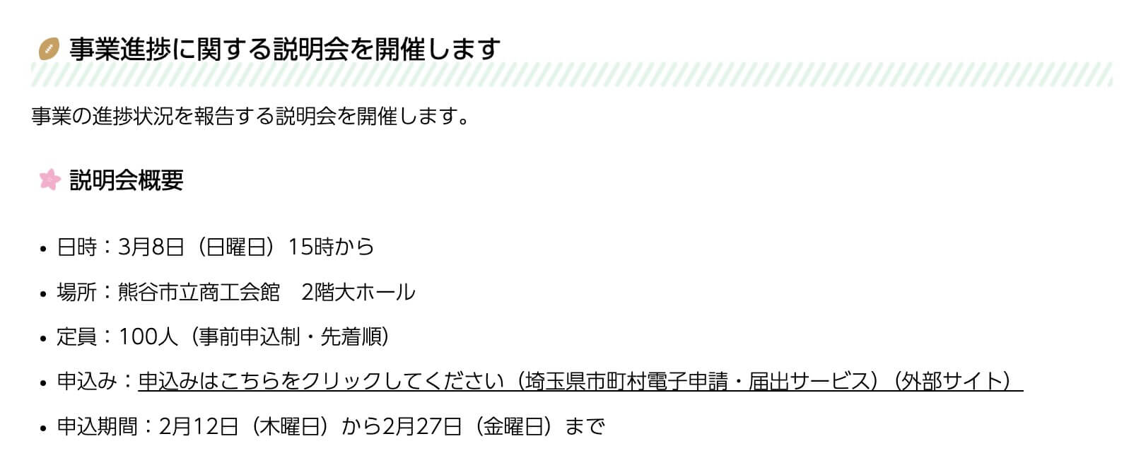 熊谷市は、現時点での検討状況を説明するため、次の内容で説明会を開催します。