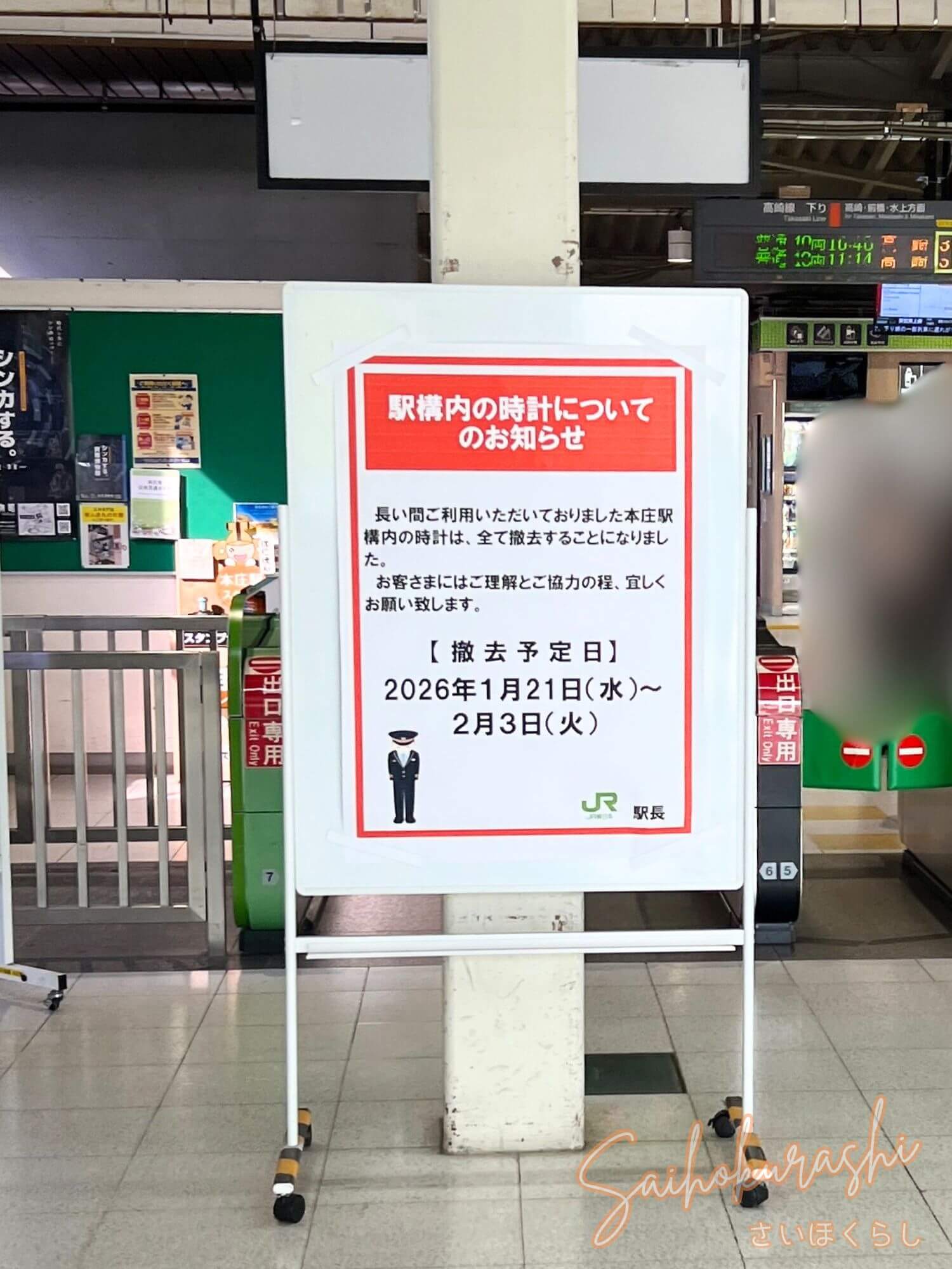 駅構内に「駅構内の時計についてのお知らせ」という掲示が出ており、これまで利用されてきた本庄駅構内の時計は、すべて撤去する予定と案内されています。