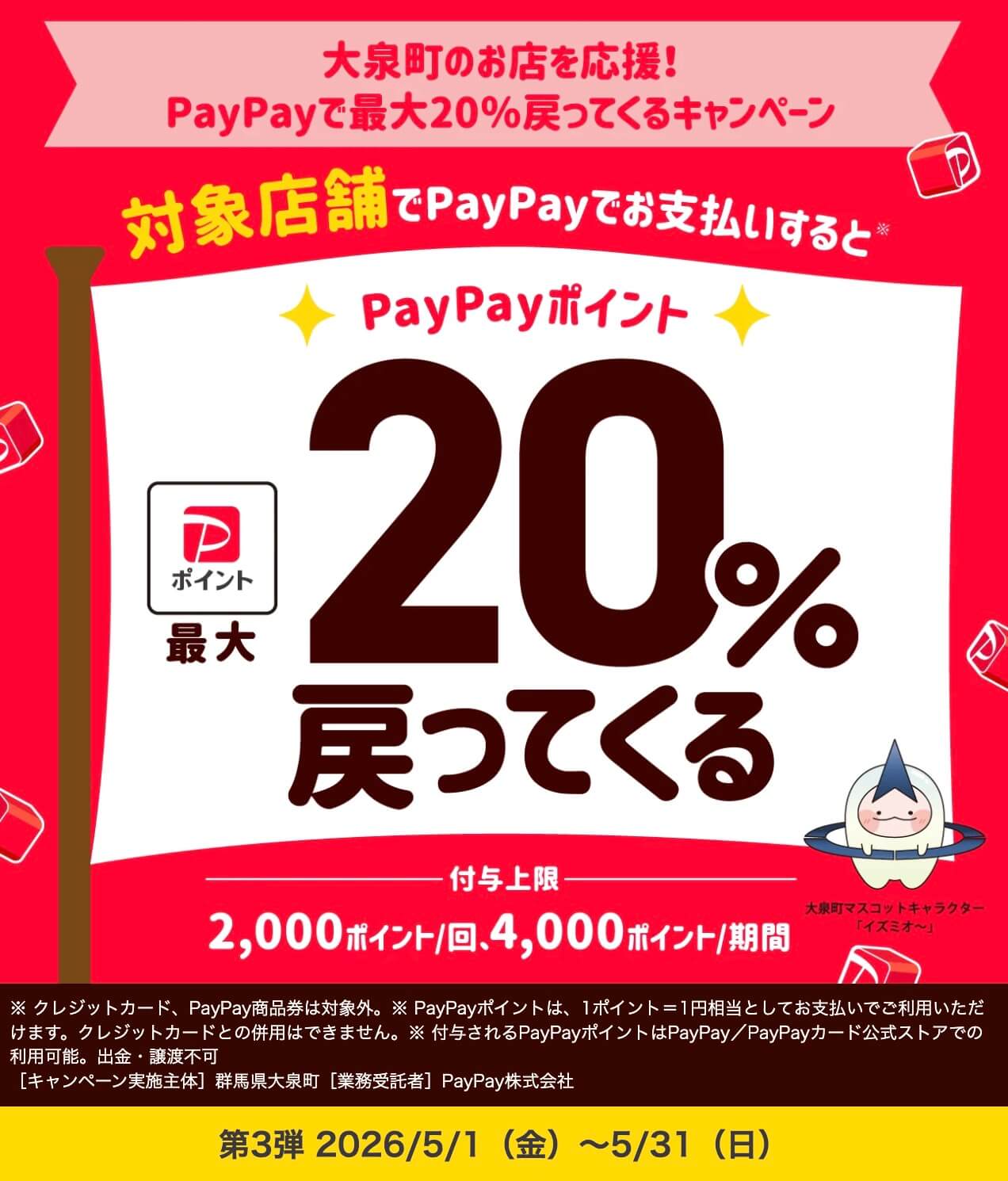 • キャンペーン名:大泉町のお店を応援!PayPayで最大20%戻ってくるキャンペーン