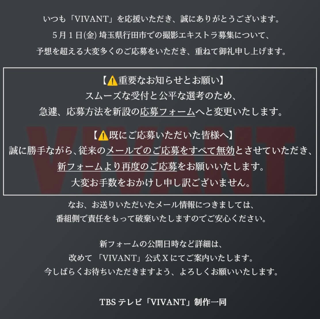 埼玉県行田市で予定されている日曜劇場『VIVANT』の撮影に関するエキストラ募集について、続報が発表されました。