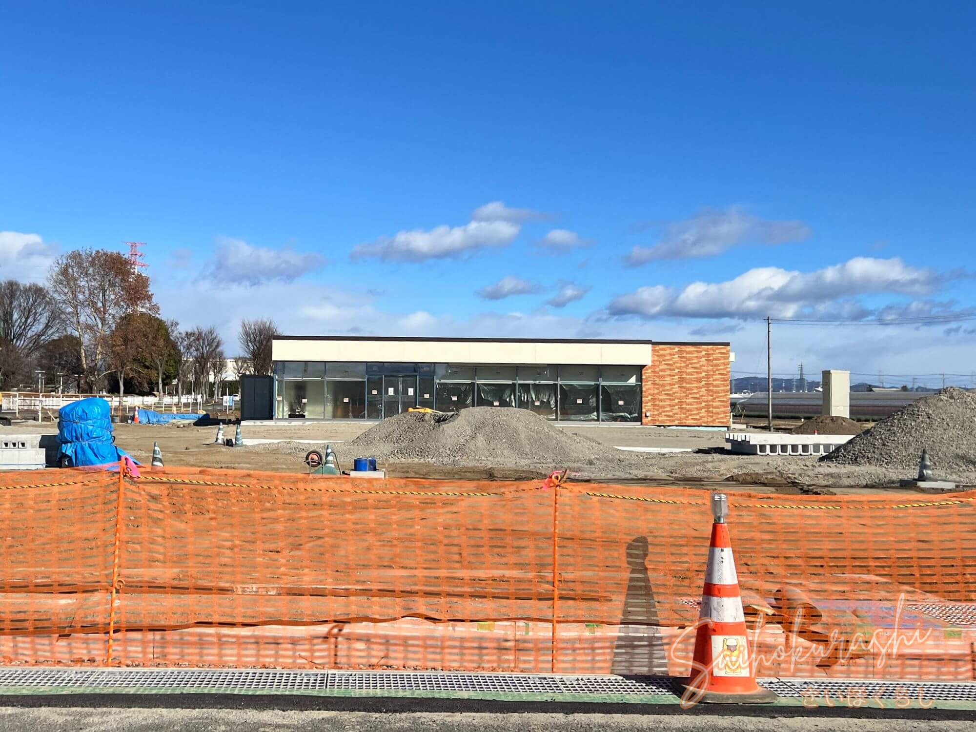 場所は境上矢島交差点の角にあたり、近くには境ふれあいパークがあります。現地ではすでに店舗建物がほぼ完成した状態となっており、セブンイレブン的な外観が確認できますね。