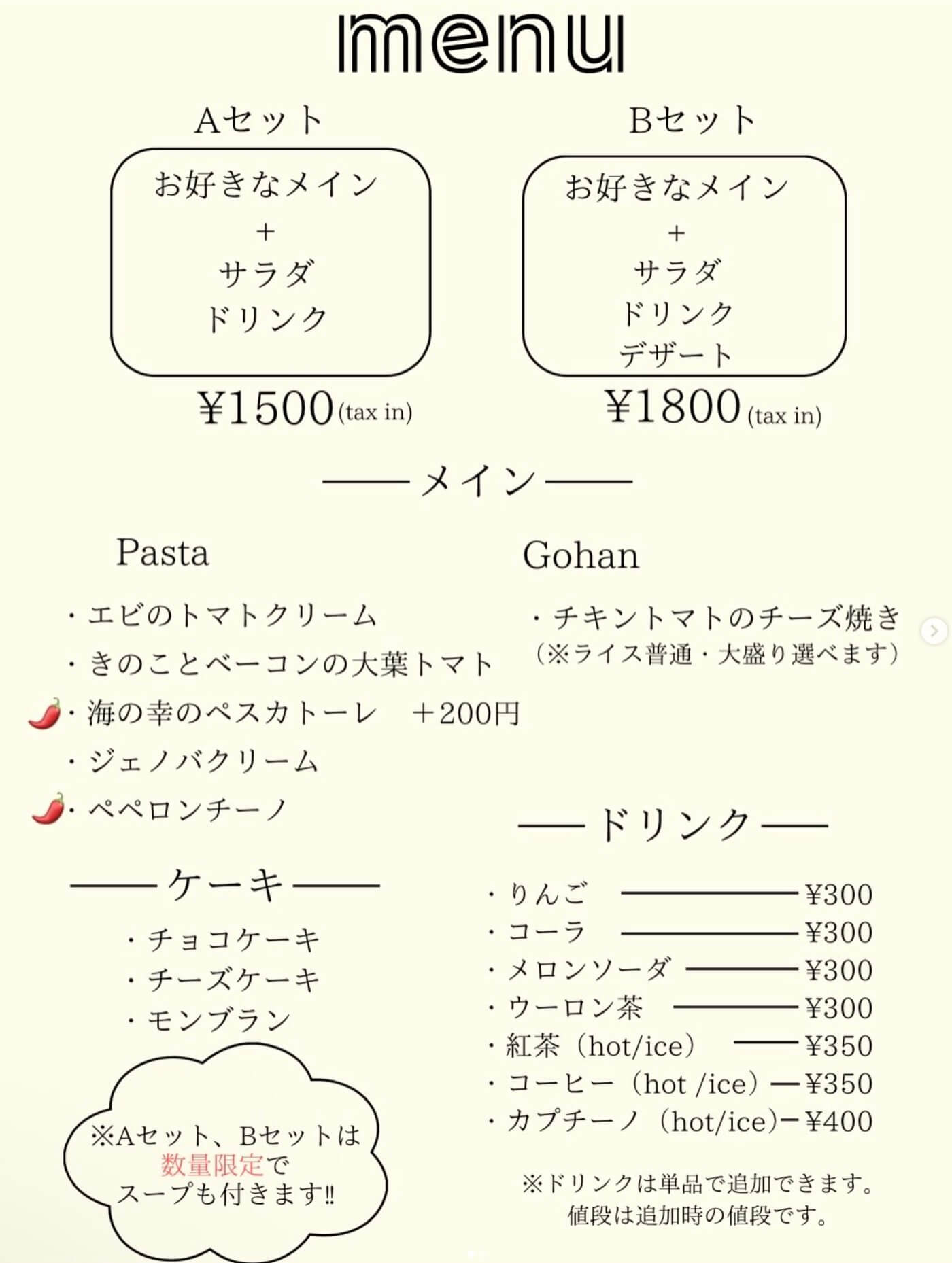 - Aセット:メイン+サラダ+ドリンク(約1,500円)