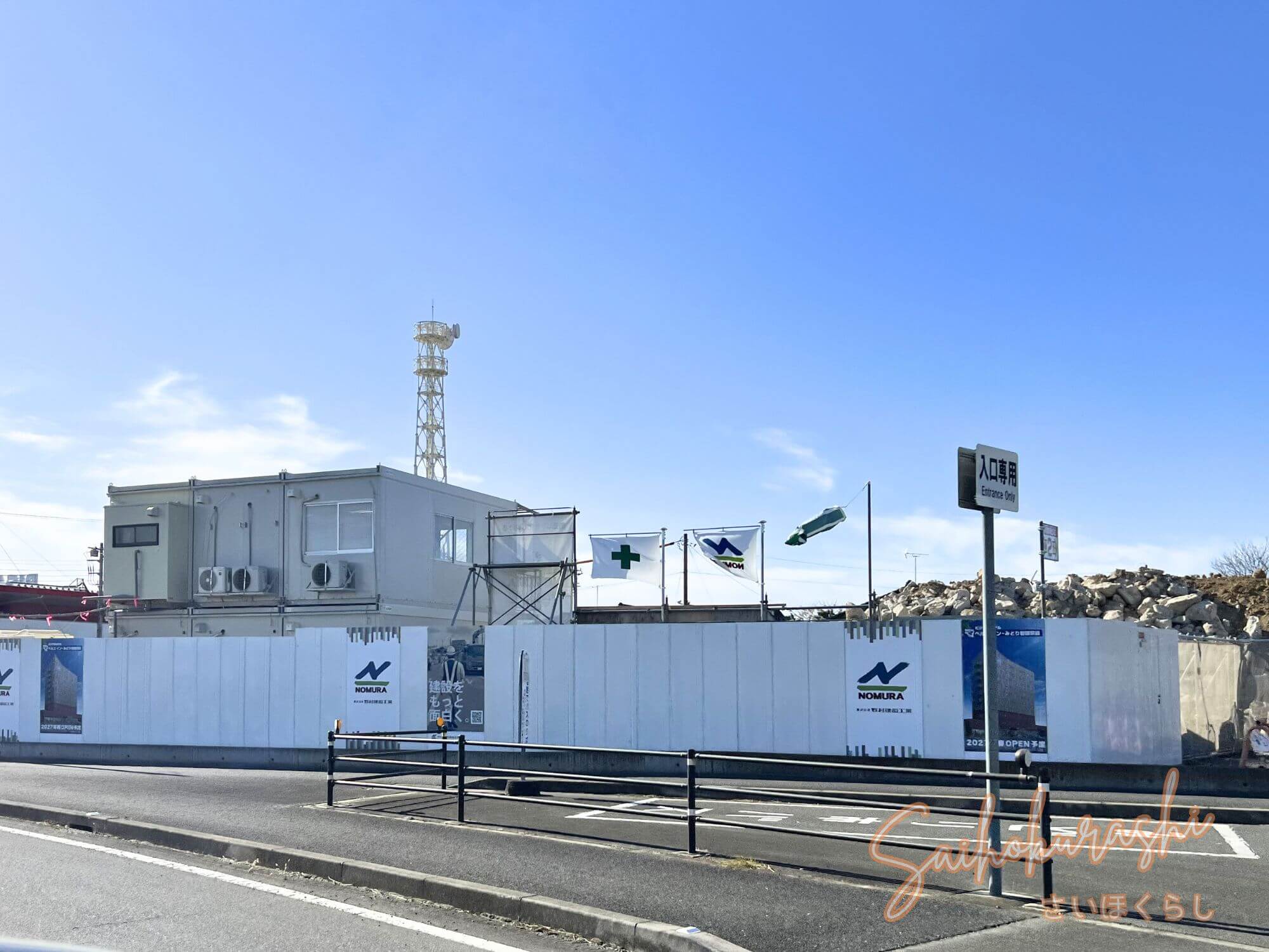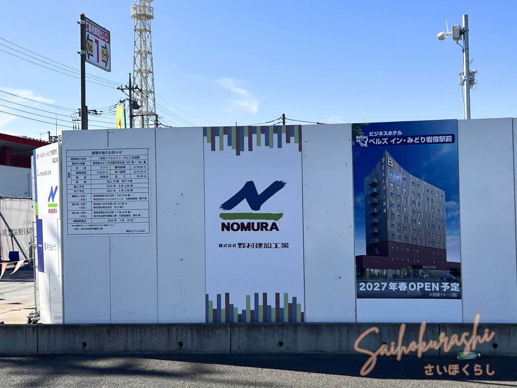現地では敷地一帯が白い仮囲いで囲われ、施工会社「野村建設工業」の表記も確認できました。