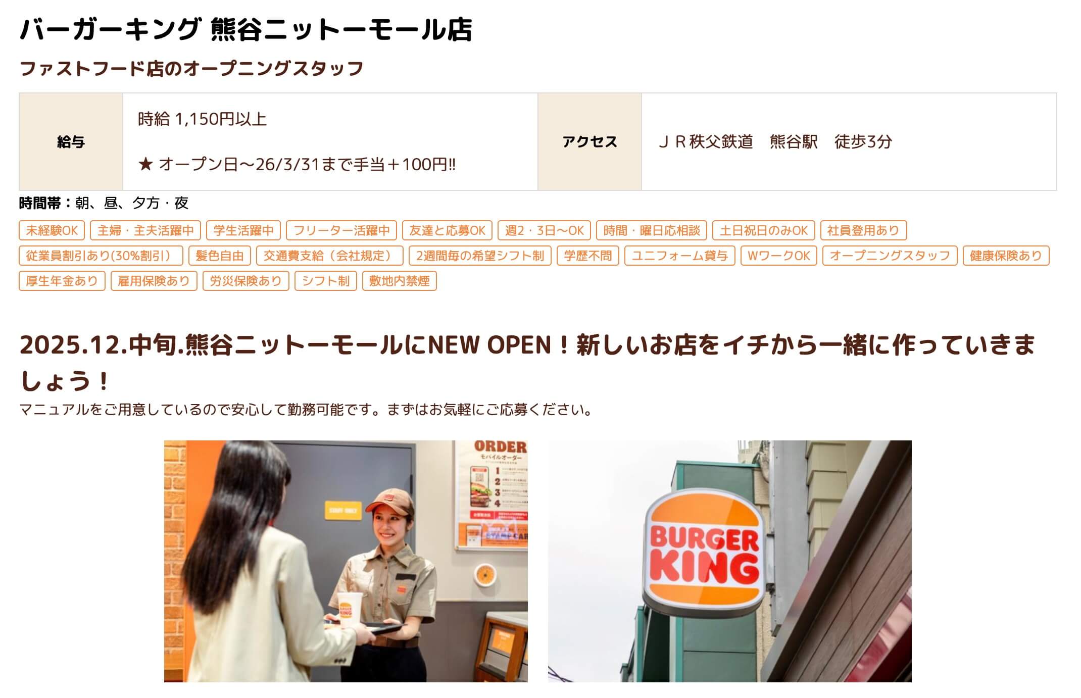 ▼『バーガーキング 熊谷ニットーモール店』のオープン情報(公式求人情報より)