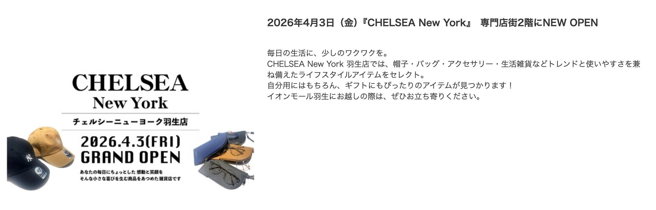 埼玉県羽生市川崎「イオンモール羽生」内に、『CHELSEA New York 羽生店』2026年4月3日(金)にオープン予定のようです。