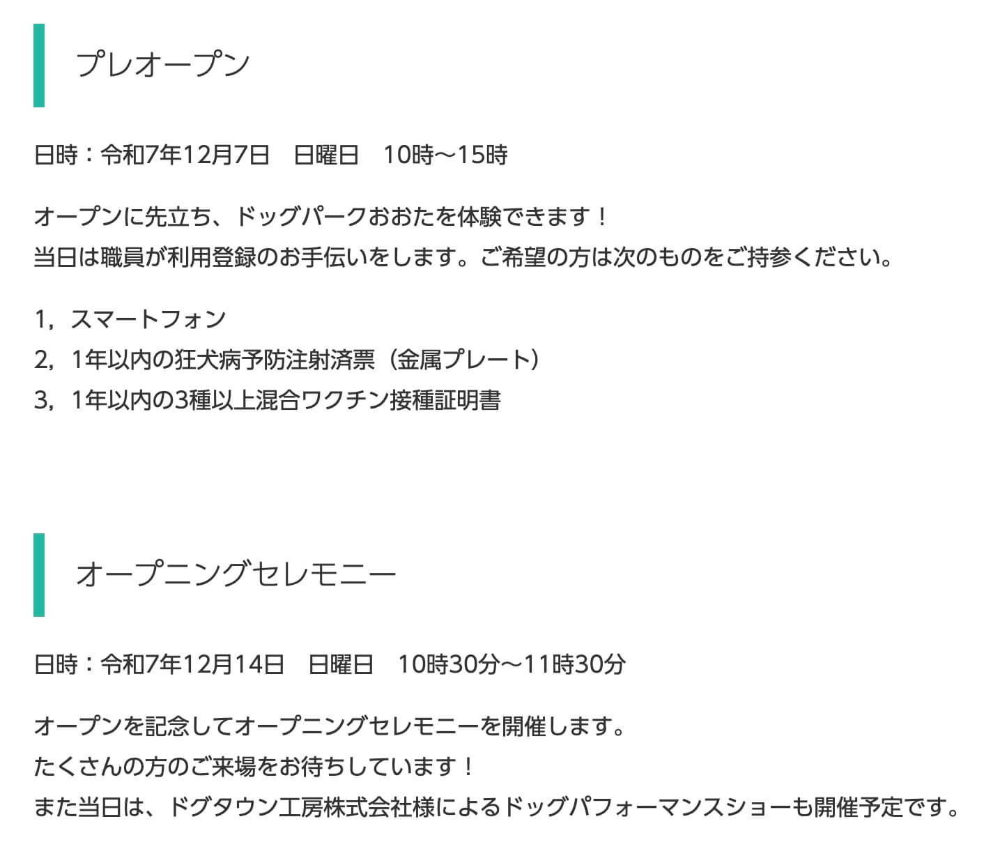 その翌週には、正式なオープンを記念して 2025年12月14日(日)10:30〜11:30 にオープニングセレモニーが開催され、ドグタウン工房株式会社によるドッグパフォーマンスショーも予定されています。