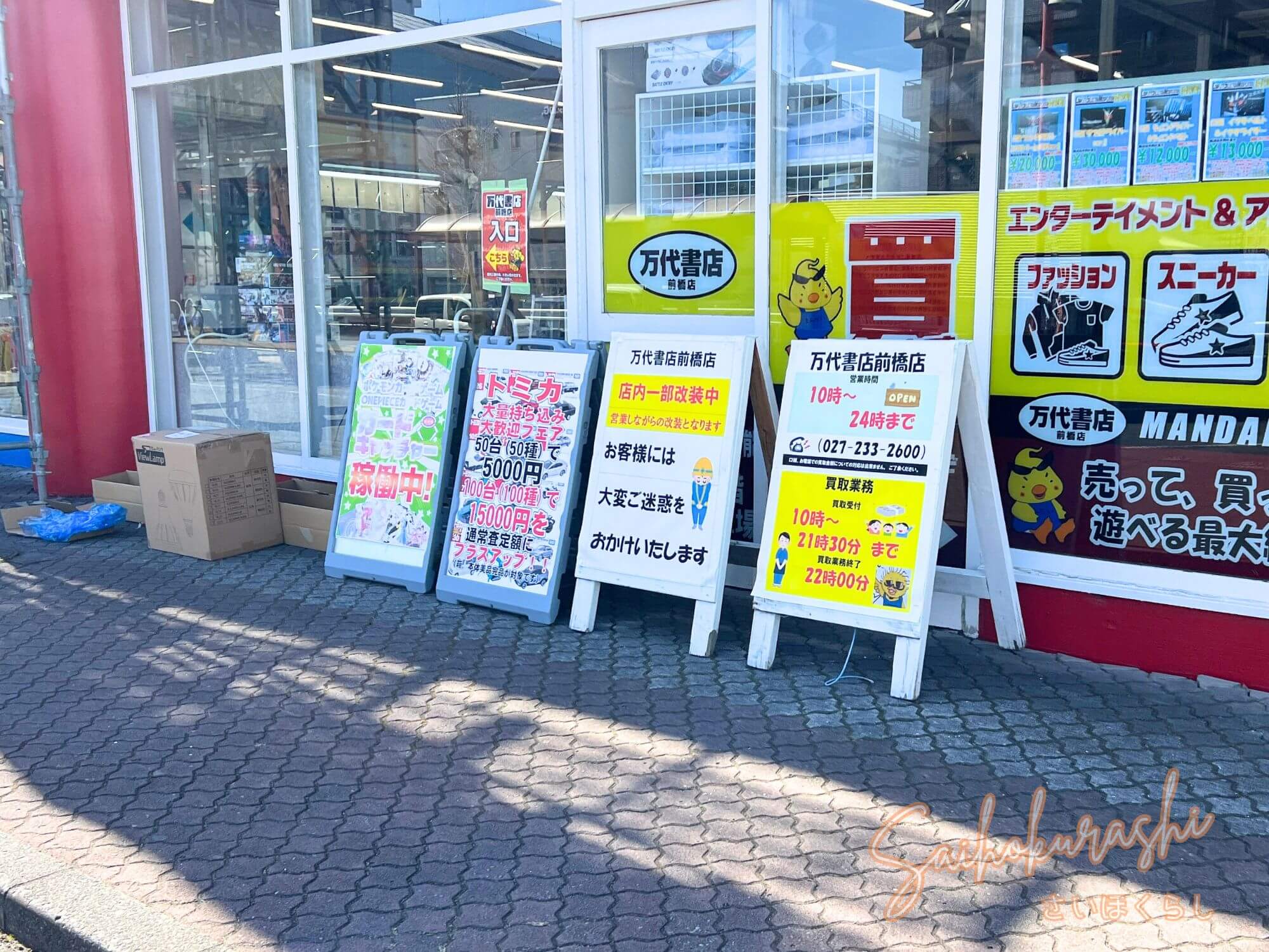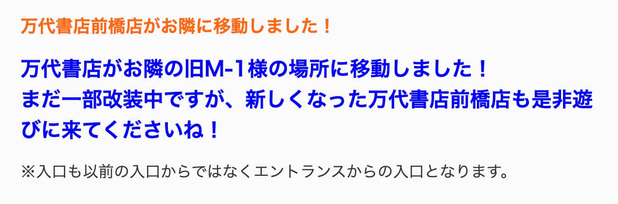 公式サイトの案内によると、万代書店前橋店が旧M-1跡地へ移動したとのお知らせが掲出されていました。