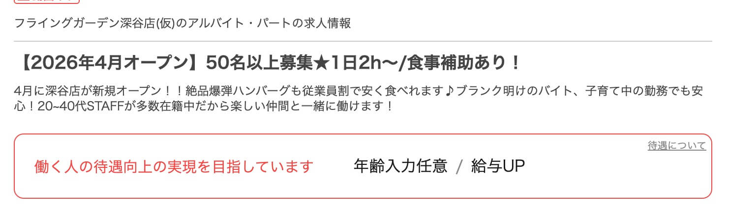 ▼求人情報によると『フライングガーデン 深谷店(仮)』は2026年4月にオープンを予定しているようです!