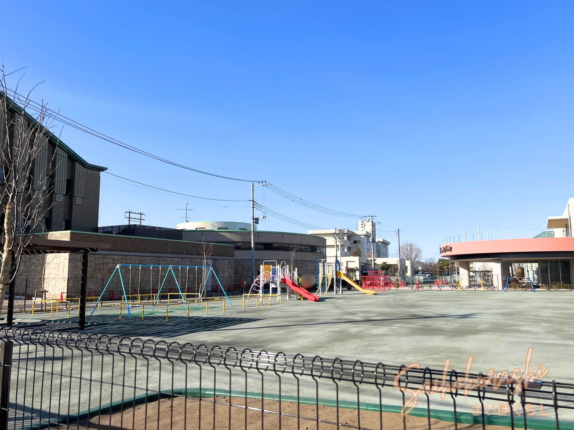 園庭にはブランコや複合遊具などが設置されており、外から見ても広々とした空間が確保されているのが分かります。