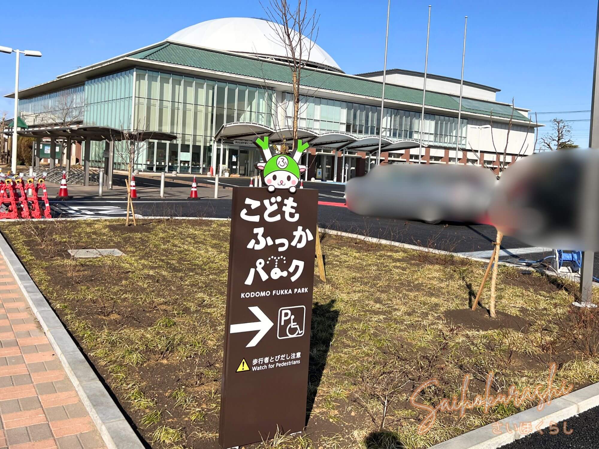 正面入口には大きく「こどもふっかパーク」のロゴが掲げられ、ふっかちゃんのイラストも確認できました。円形の屋根デザインが特徴的で、子ども向け施設らしいやわらかな雰囲気です。
