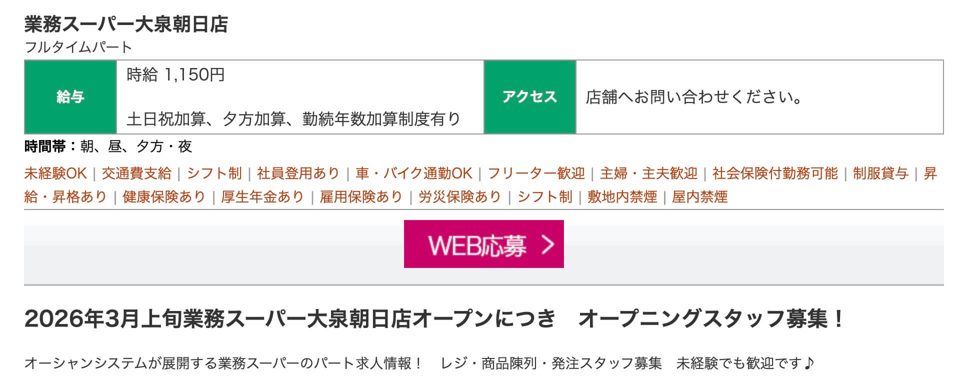 新たに確認できた公式求人情報では、「2026年3月上旬 業務スーパー大泉朝日店オープン」との記載がありました。
