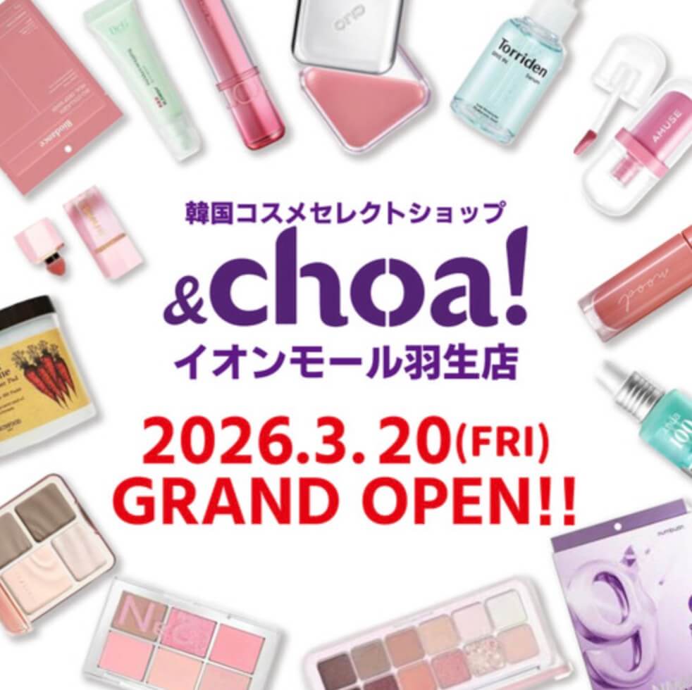 埼玉県羽生市のイオンモール羽生専門店街1階に、韓国コスメセレクトショップ『&choa!』が2026年3月20日(金・祝)にオープン予定です。