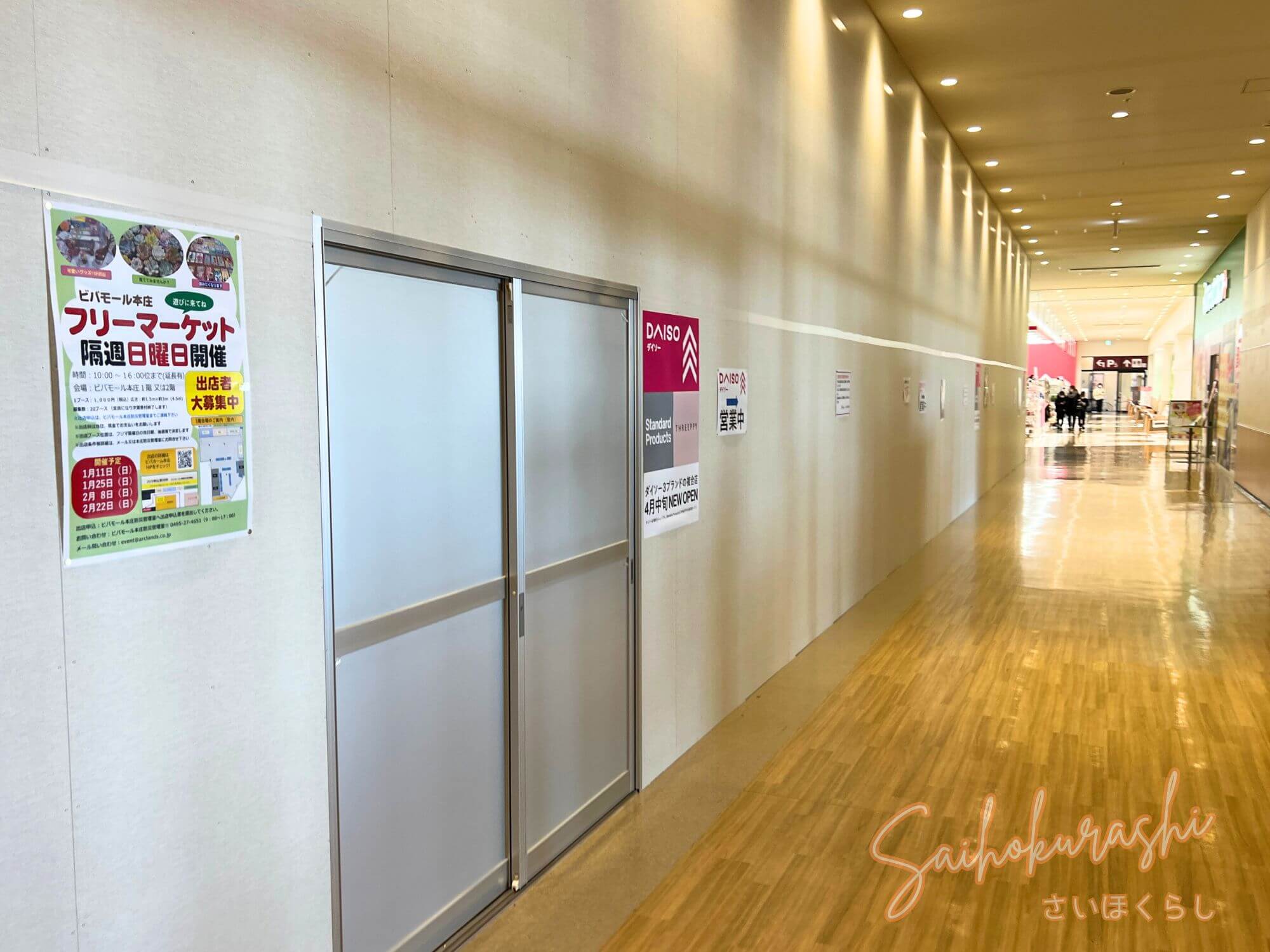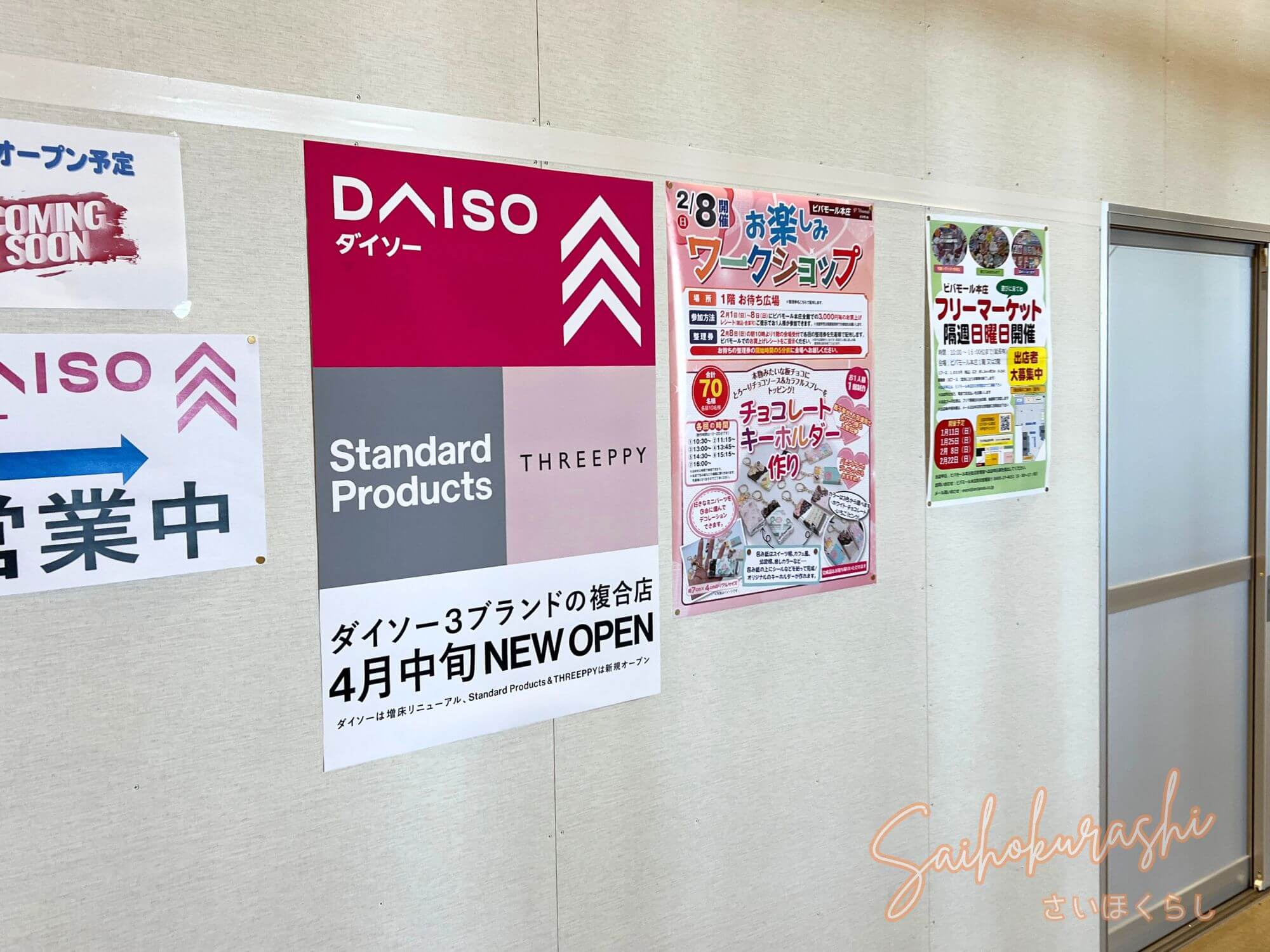 埼玉県本庄市中央の商業施設「ビバモール本庄」2階に、『ダイソー3ブランド複合店』(「DAISO」「Standard Products」「THREEPPY」)がオープン予定のようです。