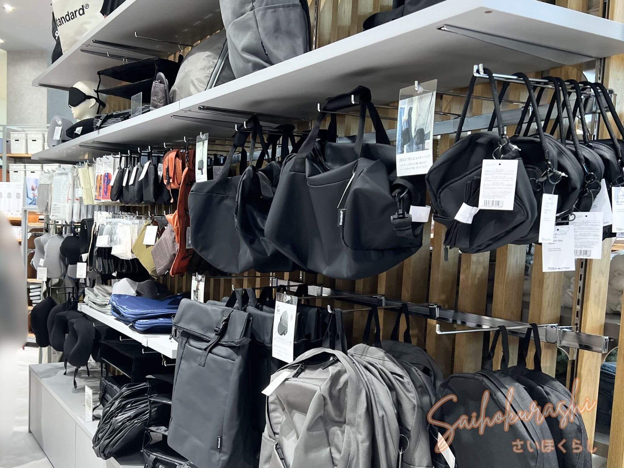 バッグ類もかなり充実していて、シンプルなトートやリュック、黒やグレーを基調にした実用的なアイテムが多く並んでいました。