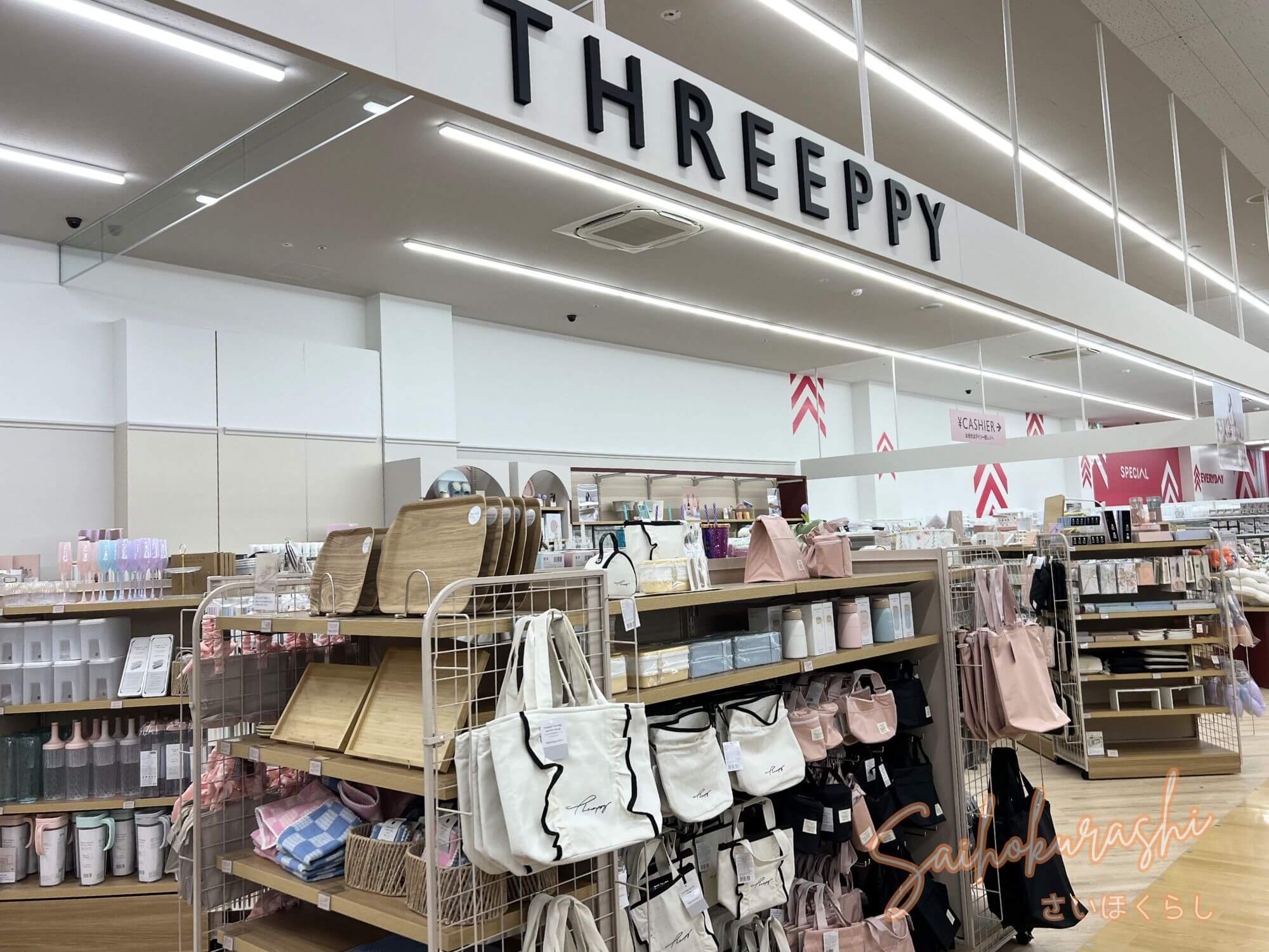 日用品中心のダイソーに加えて、少し上質な生活雑貨が並ぶ「Standard Products」、かわいい系の雑貨がそろう「THREEPPY」まで、まとめて見られる構成になっています。