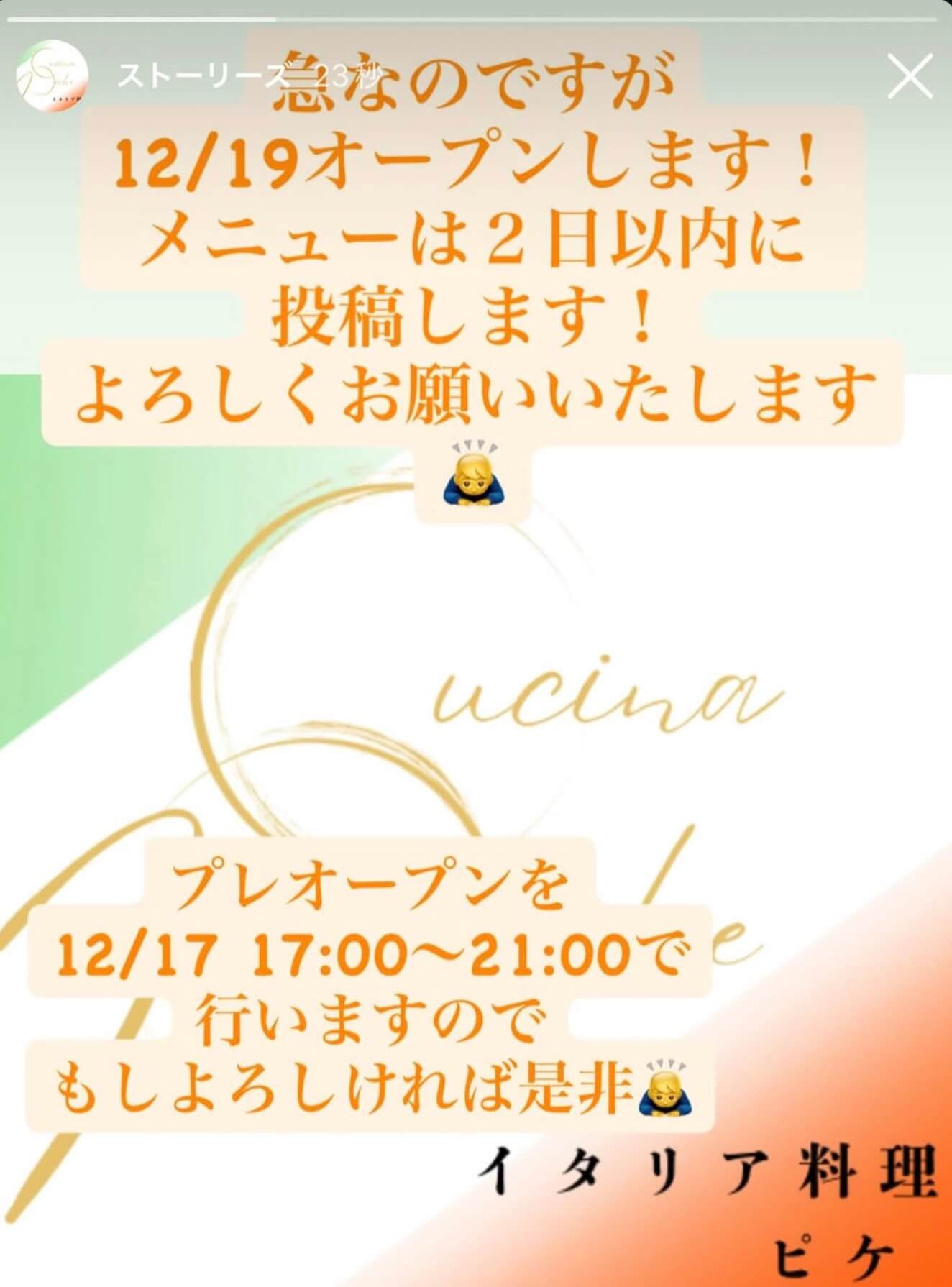 ▼『イタリア料理 ピケ』のオープン情報(公式インスタグラムより)
