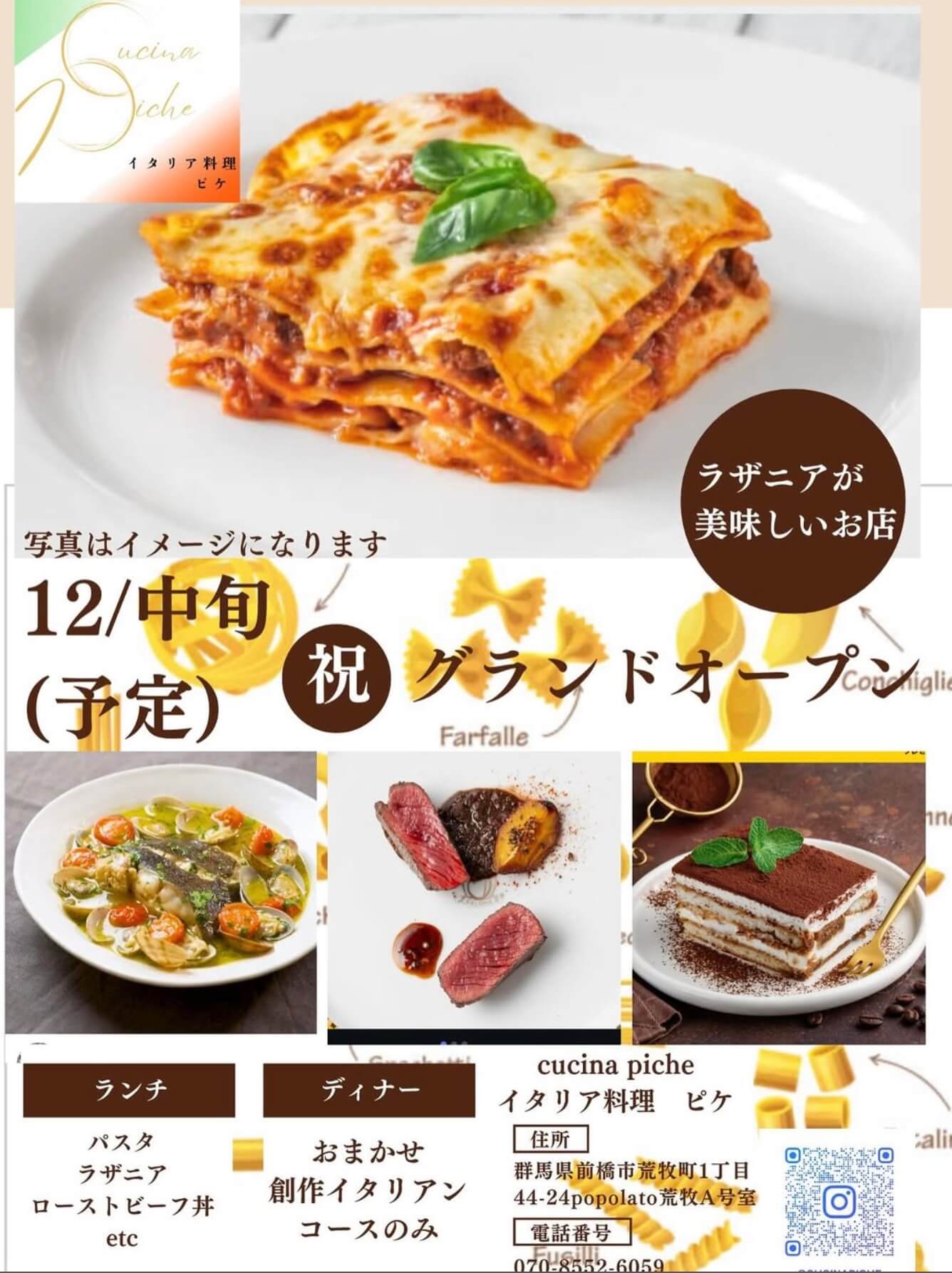 『イタリア料理 ピケ』が2025年12月19日にオープン予定(群馬・前橋市)