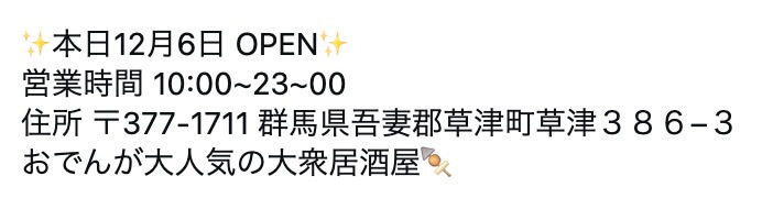 群馬県吾妻郡草津町草津386-3に、居酒屋チェーン「居酒屋らぷん」の新店となる『居酒屋らぷん 草津店』が2025年12月6日にオープンしました。